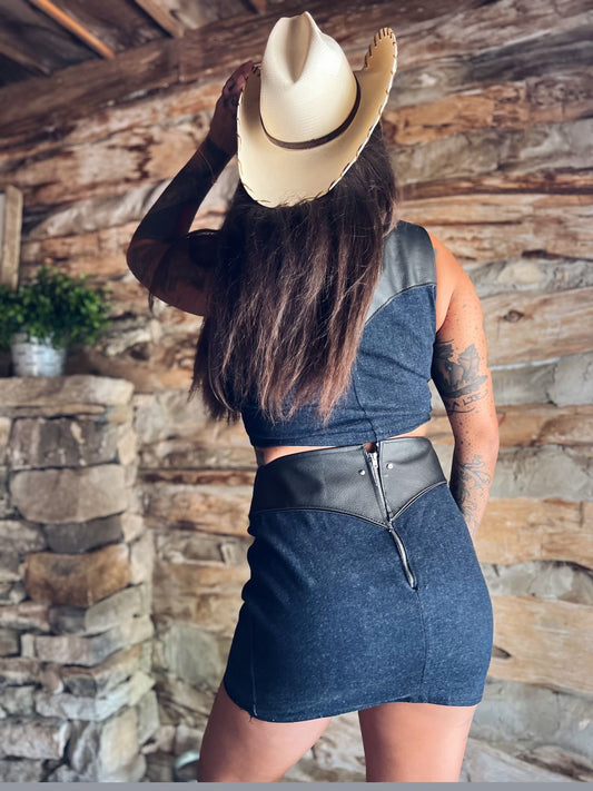 Blue Jean Outlaw Queen Leather and Denim Skirt - Antoniette