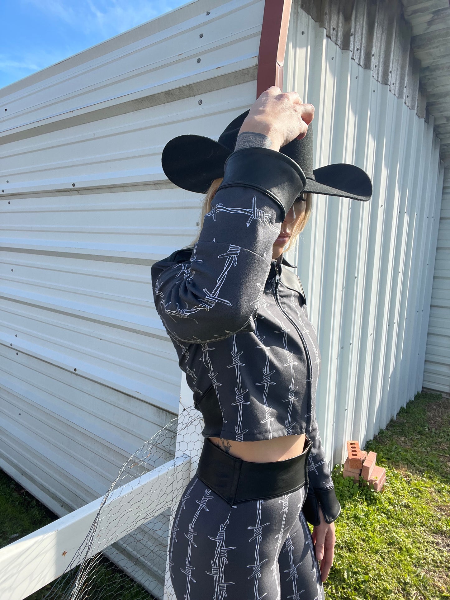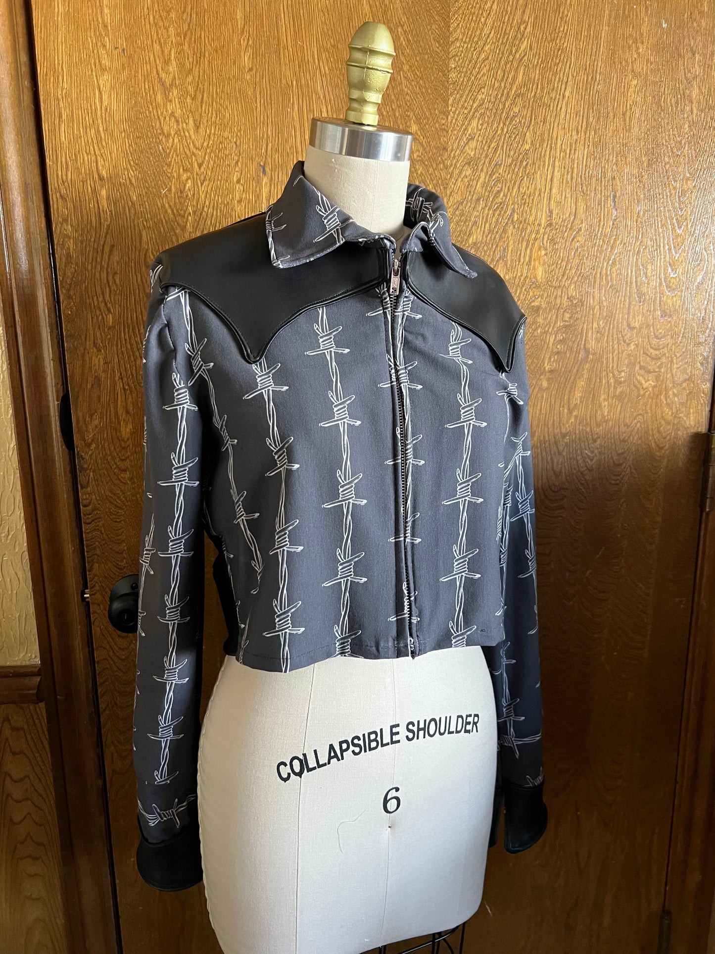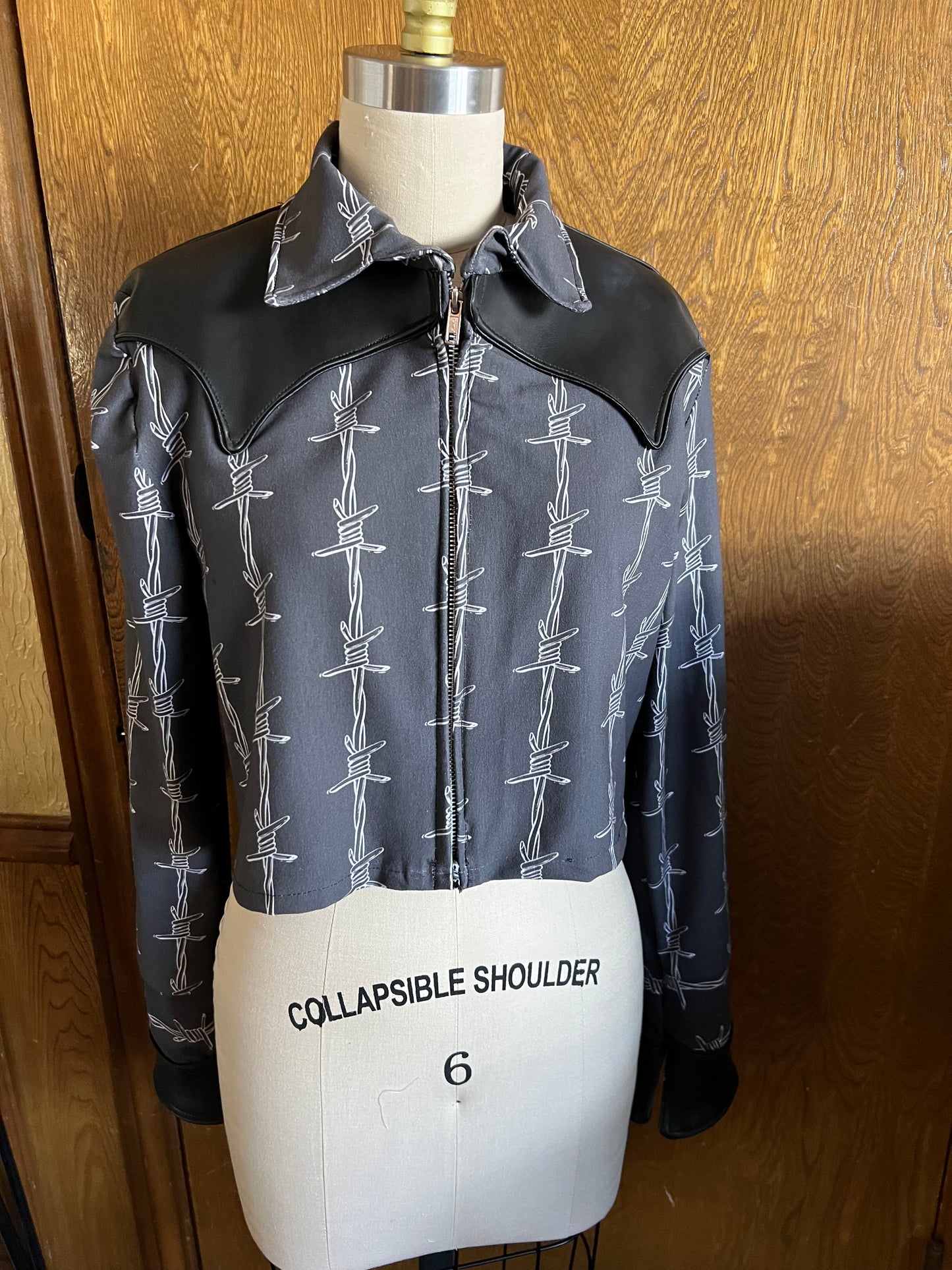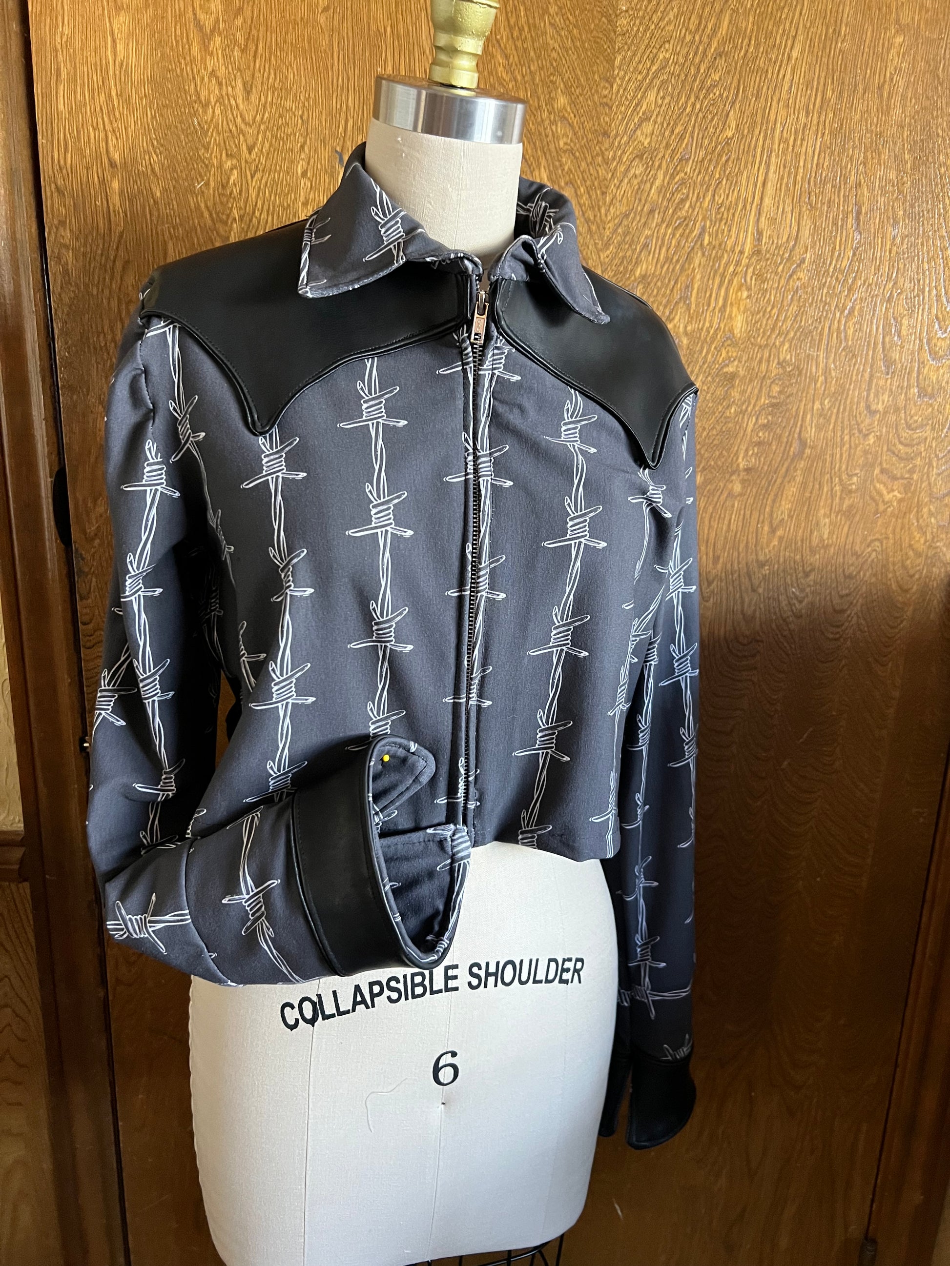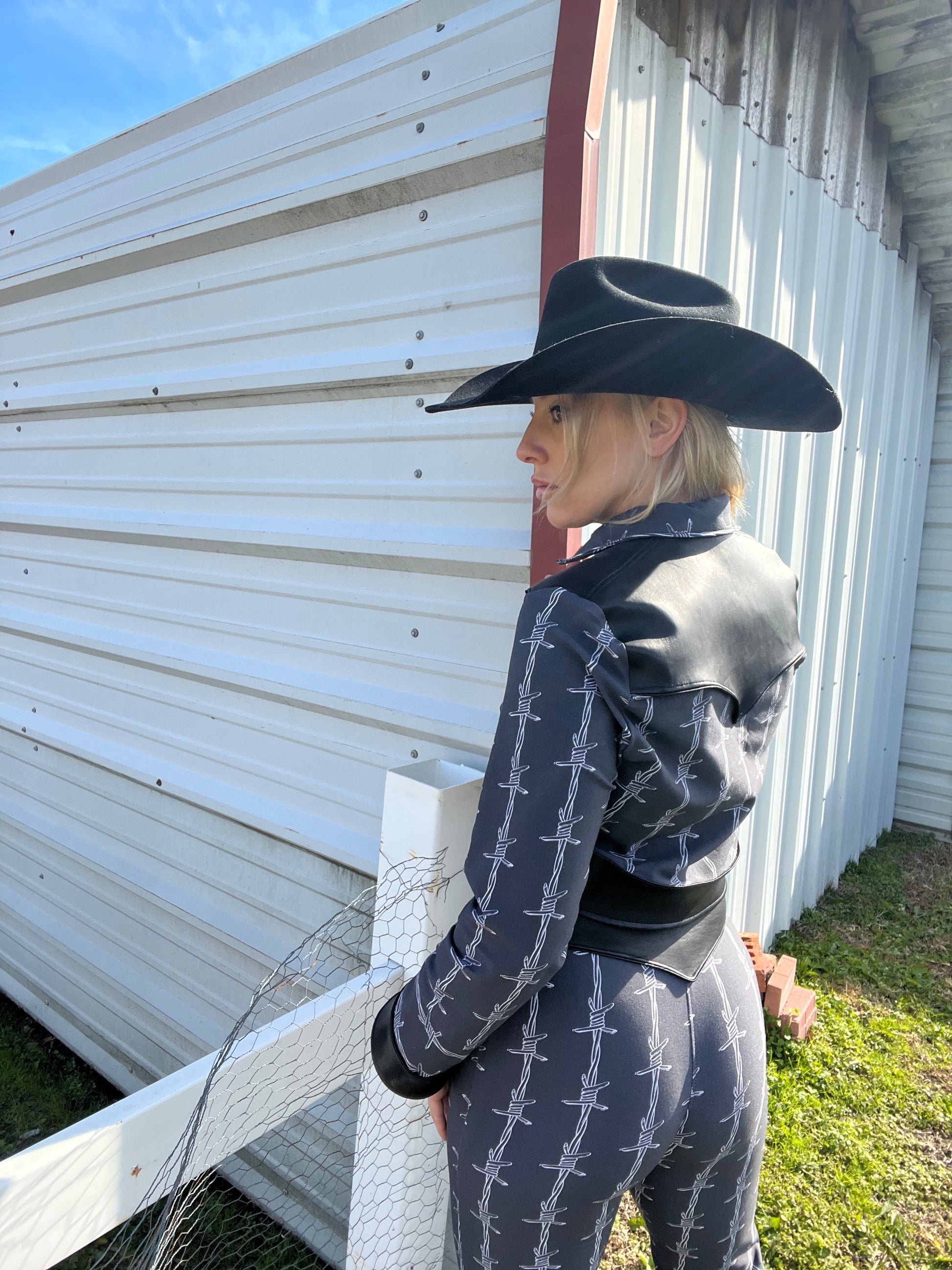 Made to order, Dolly’s Western Barb Wire jacket features a custom printed jersey stretch knit fabric with lamb skin leather western details. Pants sold separately!