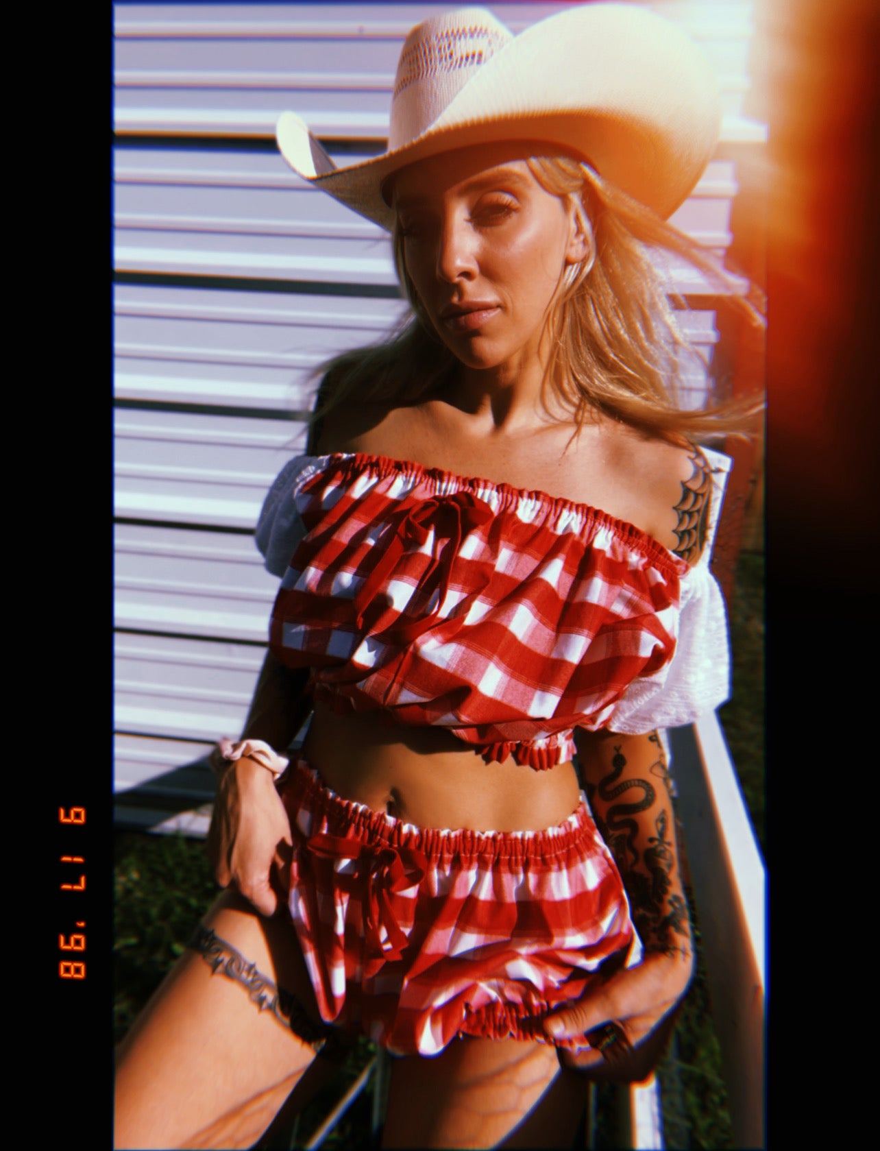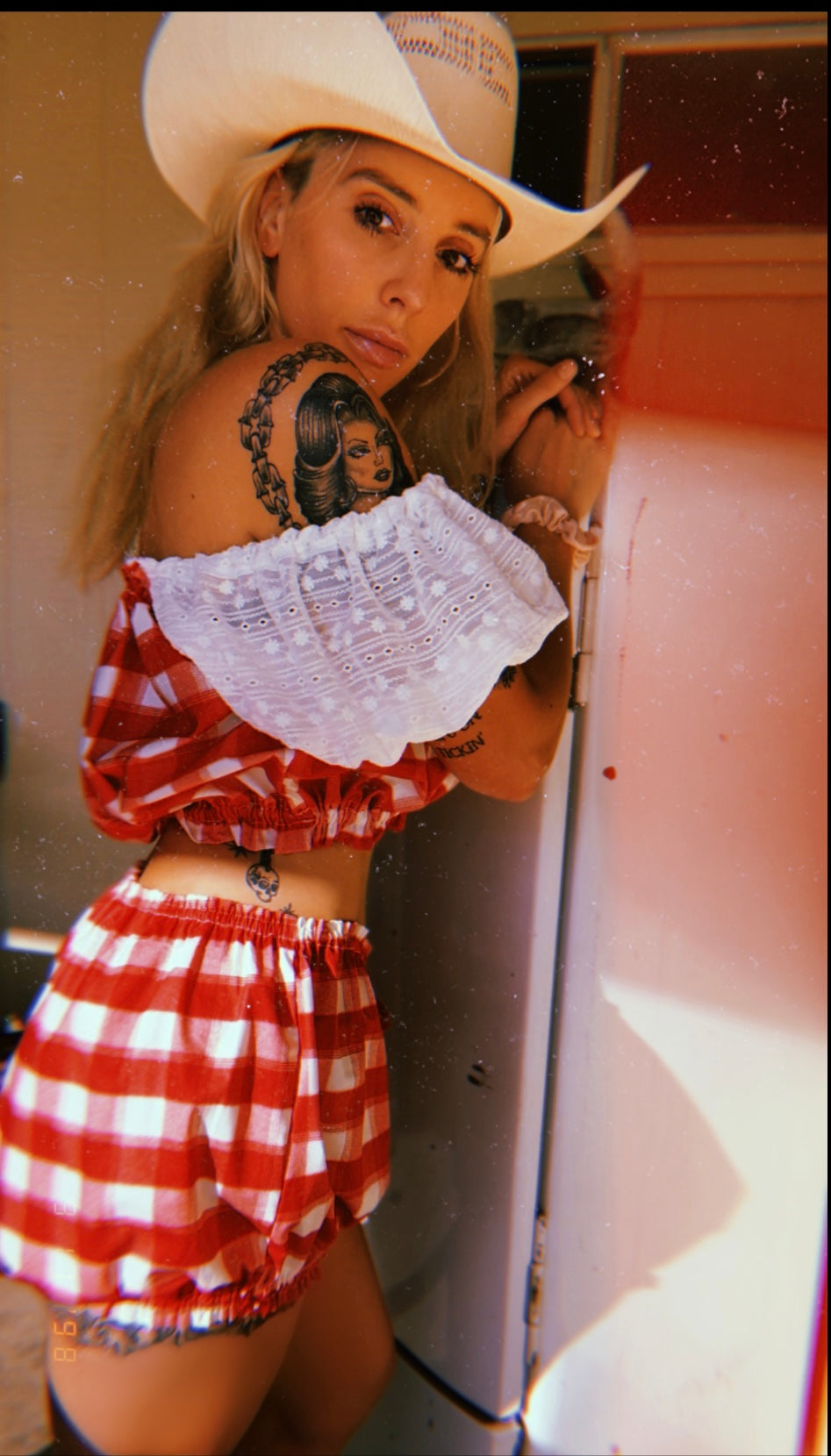 Made to order cotton gingham bloomers shorts and blouse with red velvet ribbon.