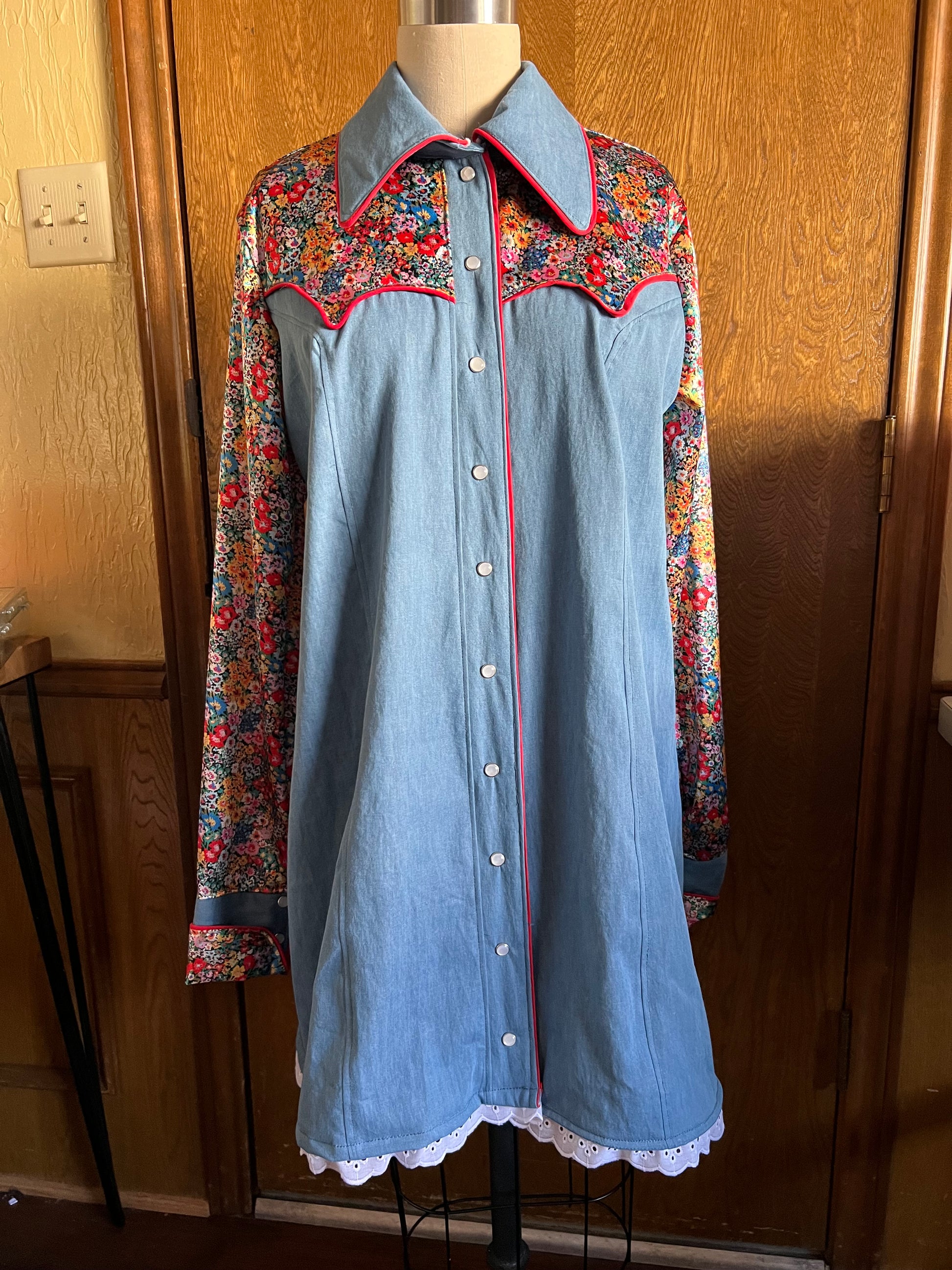 Made to order retro style house dress with pearl snap closure. Dress is made out of denim and a floral satin.