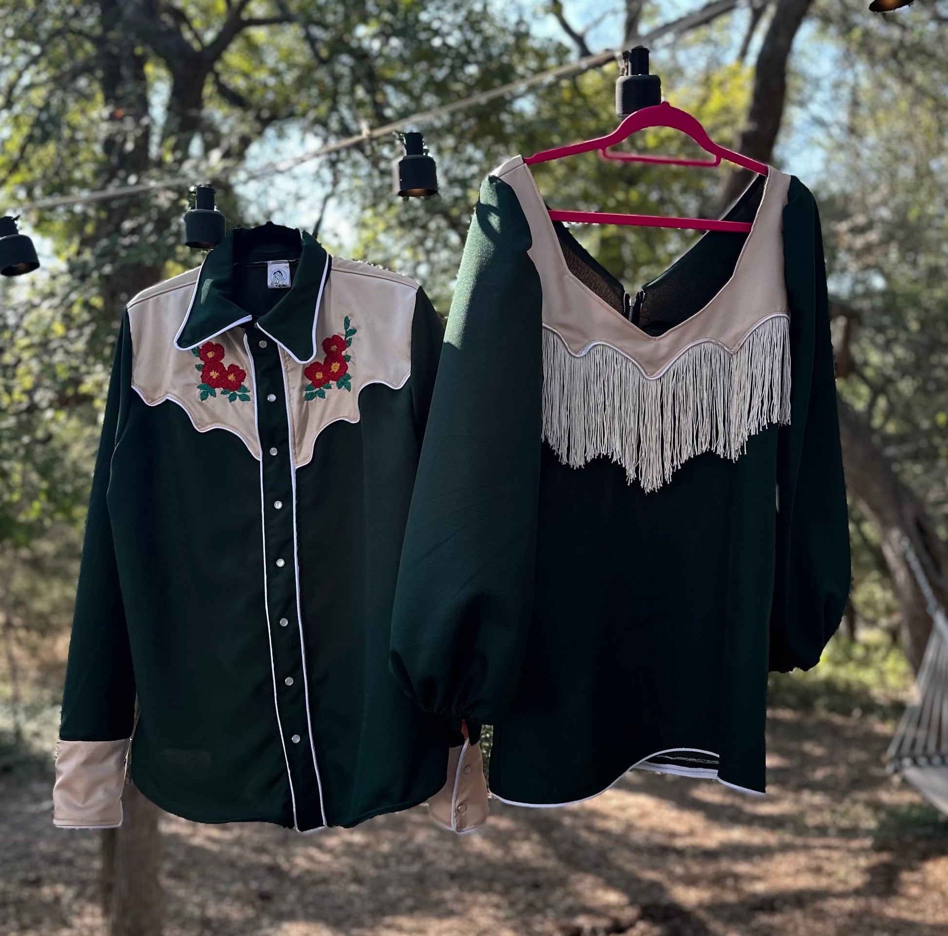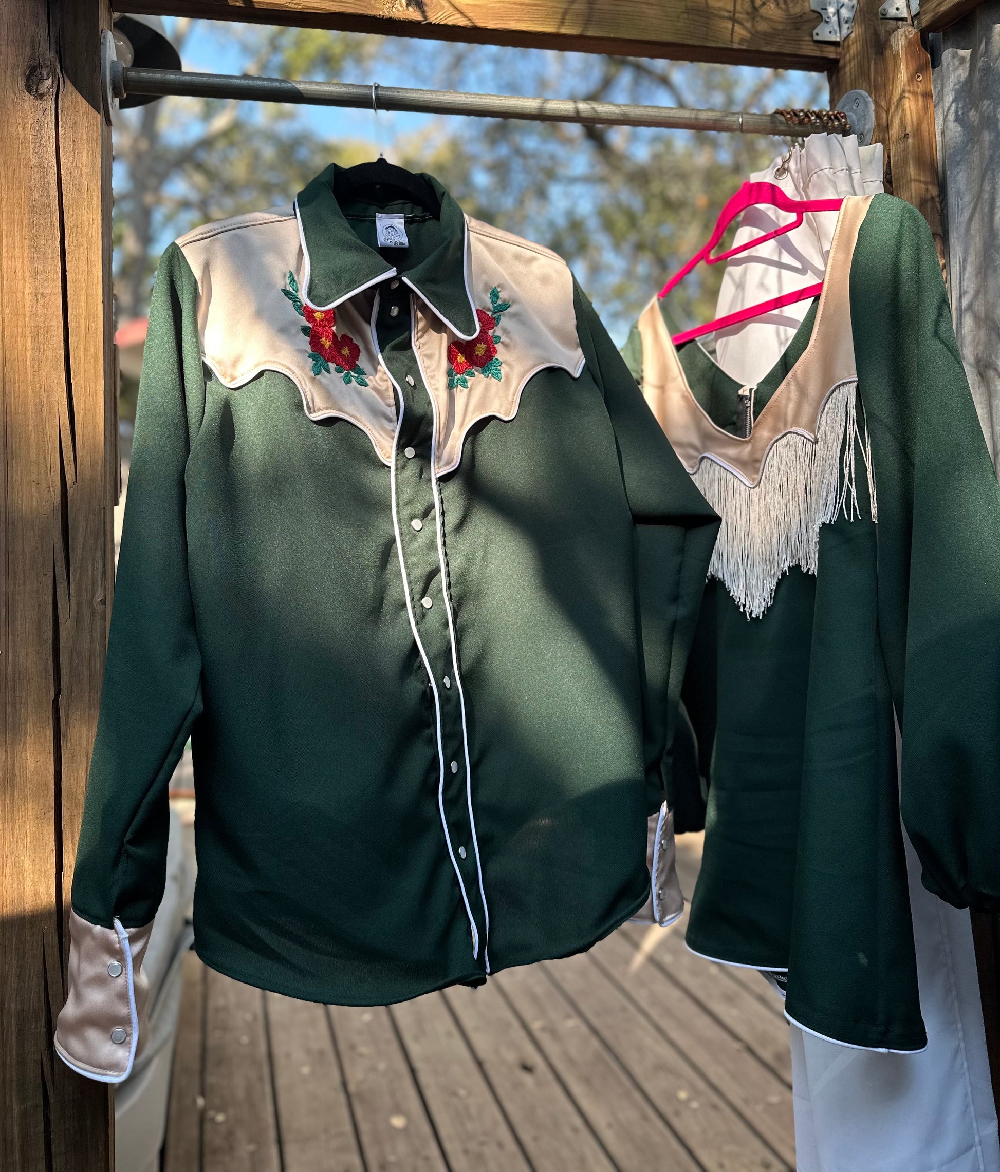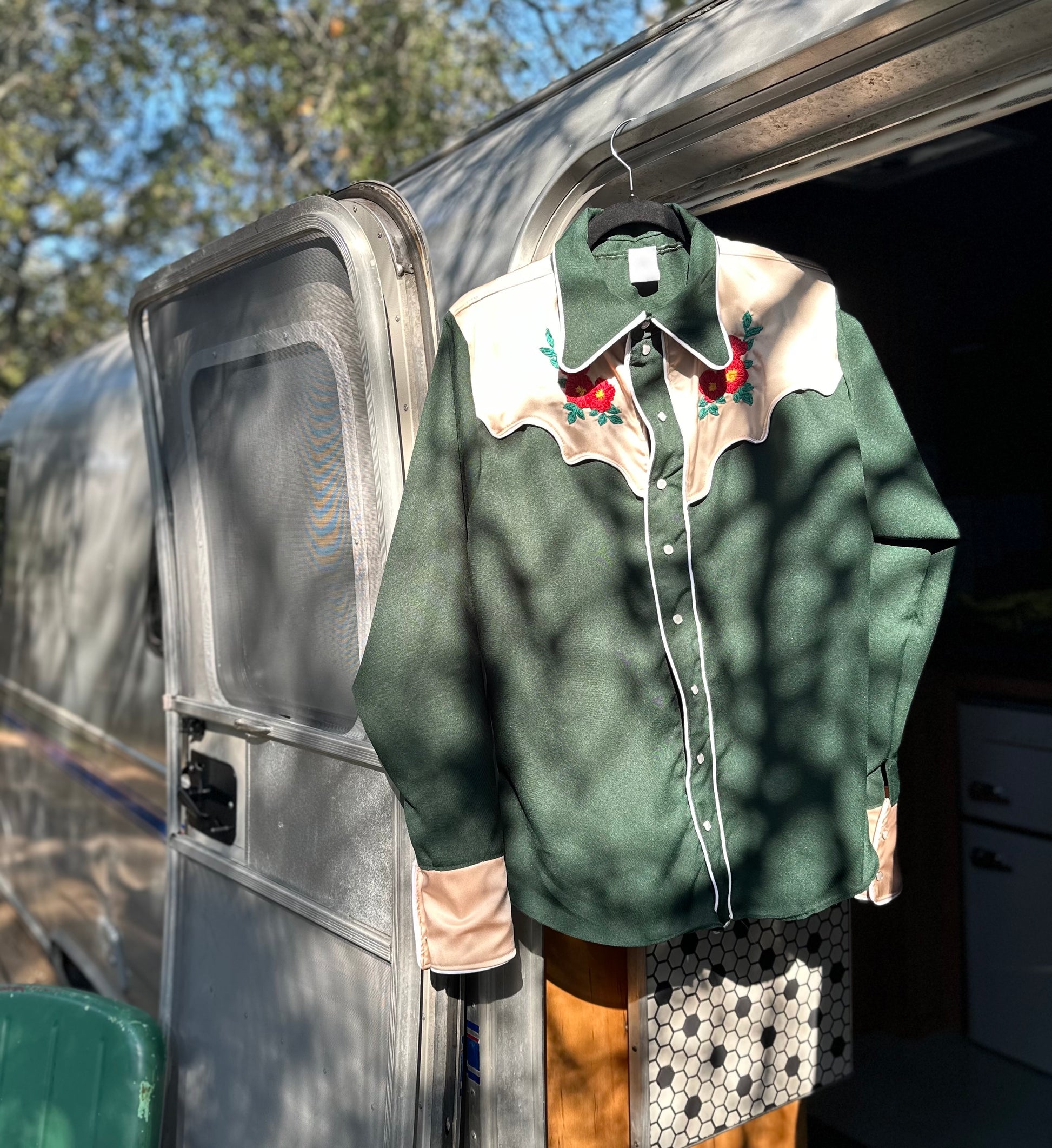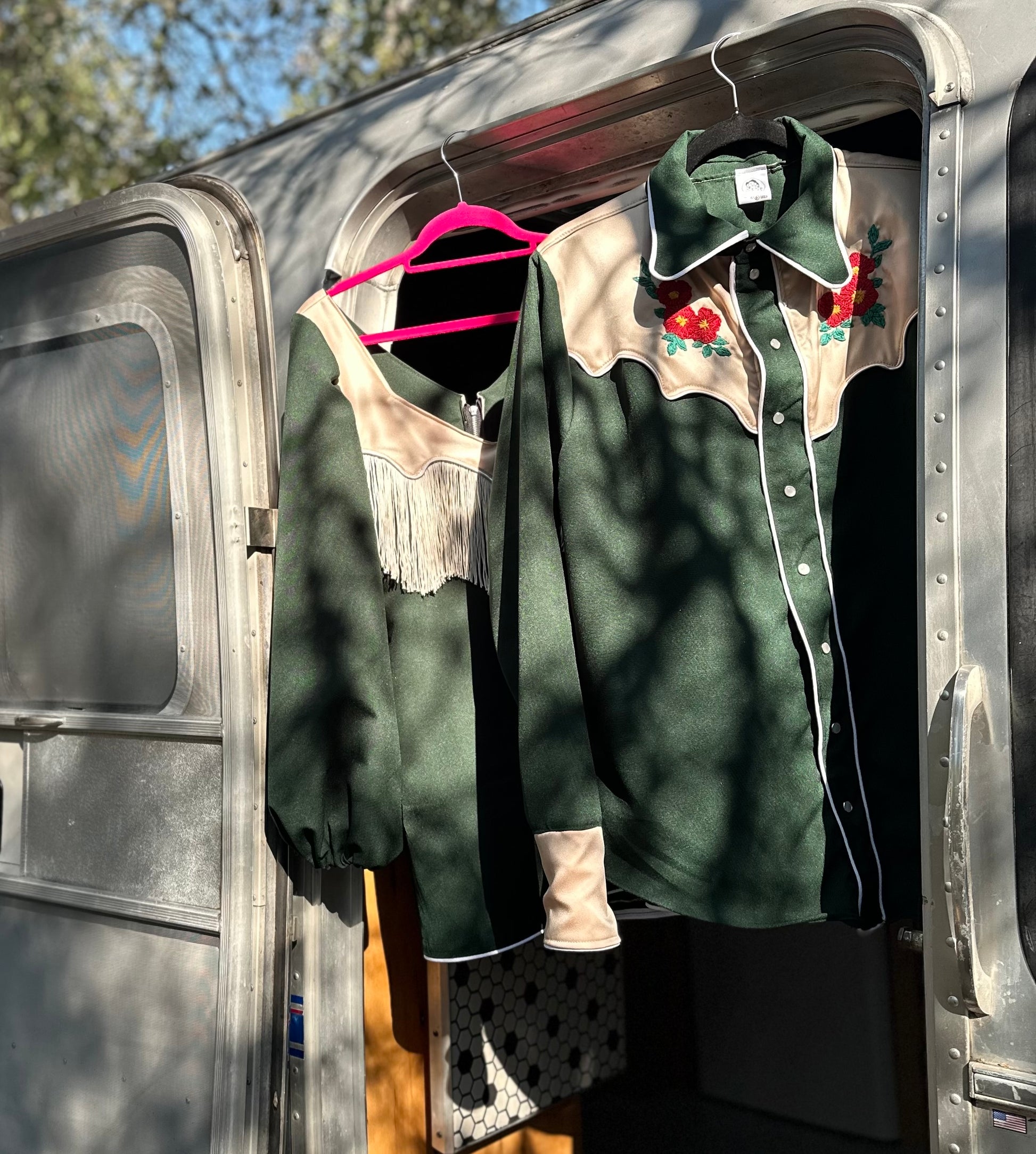 Made to order pearl snap cut from a cotton poly blend, lightweight and breathable. Yolk is a lightweight satin trimmed with satin piping. Floral embroidery is hand drawn and hand sewn. Pearl snap design and embroidery is customizable!