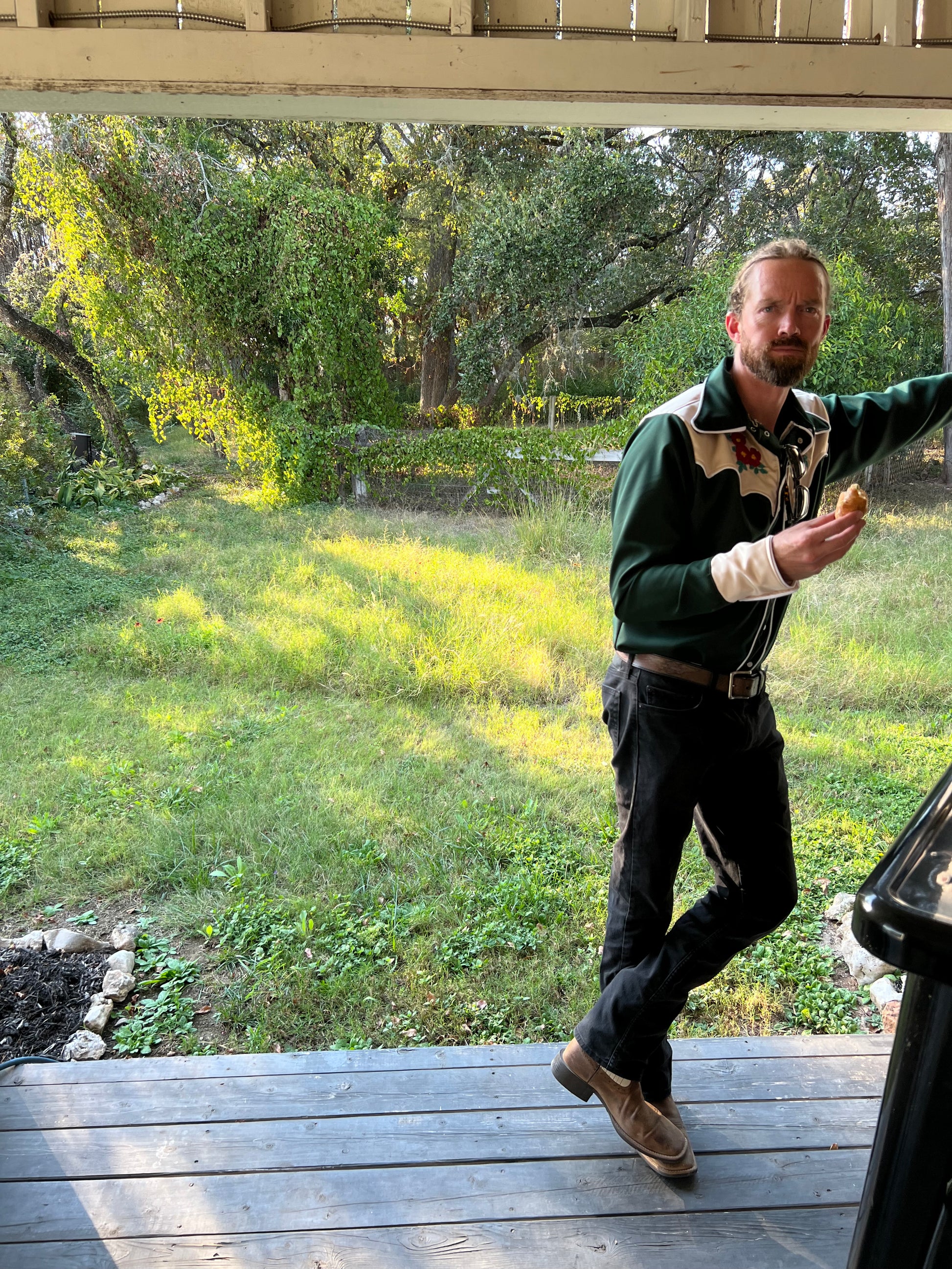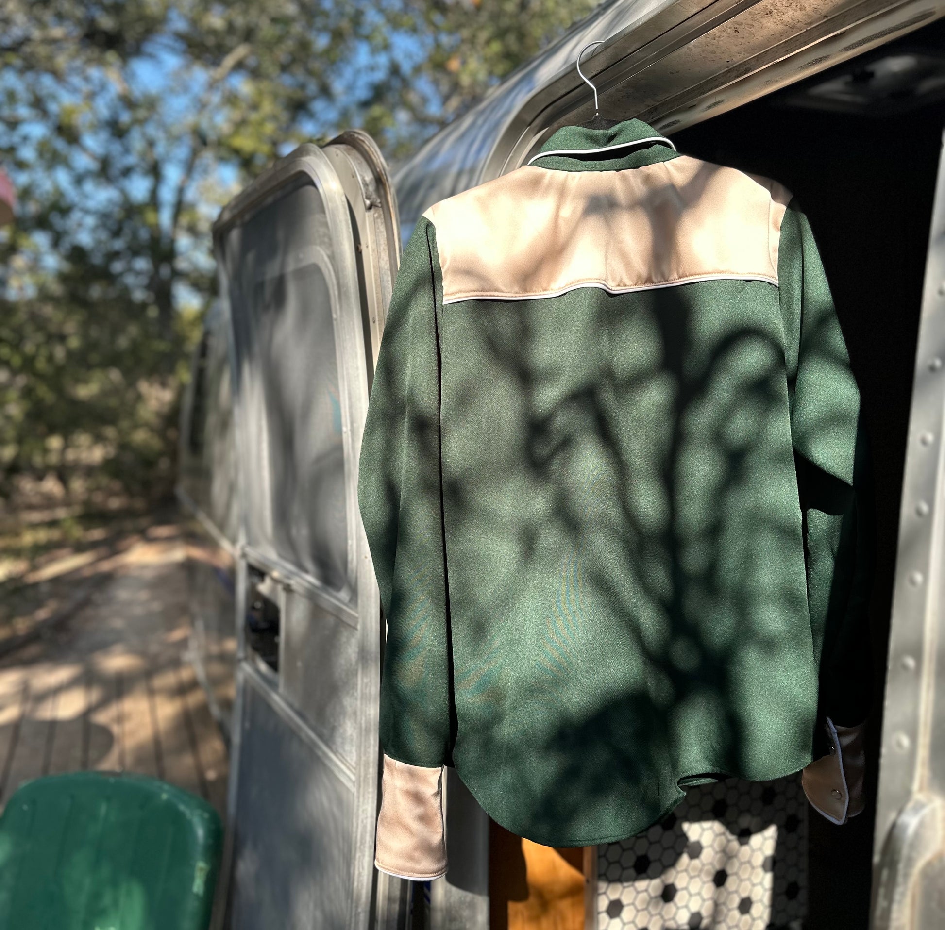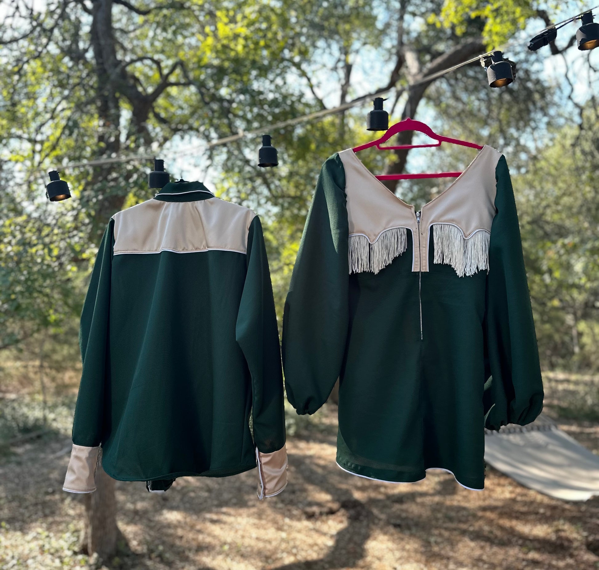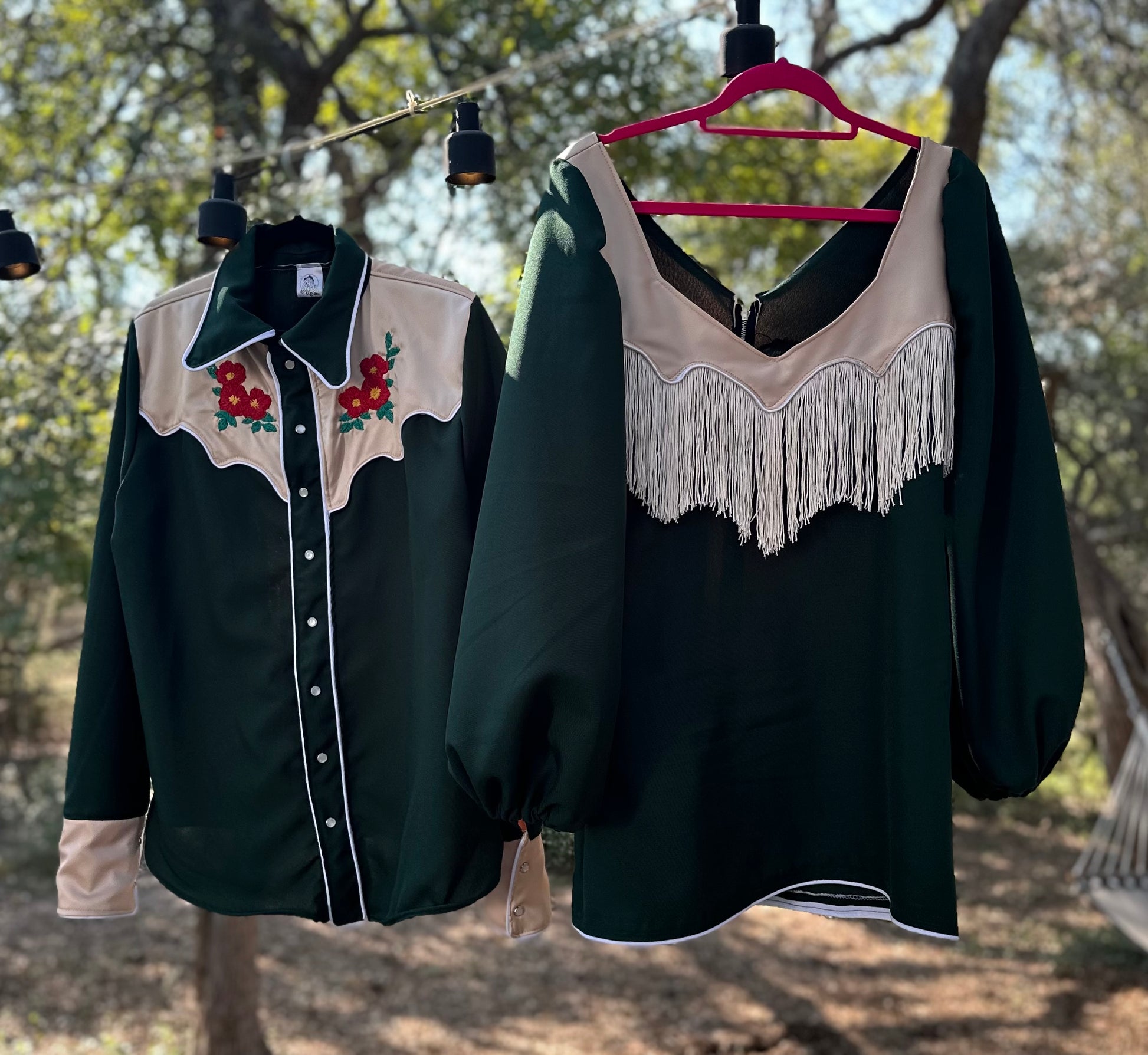Made to order pearl snap cut from a cotton poly blend, lightweight and breathable. Yolk is a lightweight satin trimmed with satin piping. Floral embroidery is hand drawn and hand sewn. Pearl snap design and embroidery is customizable!
