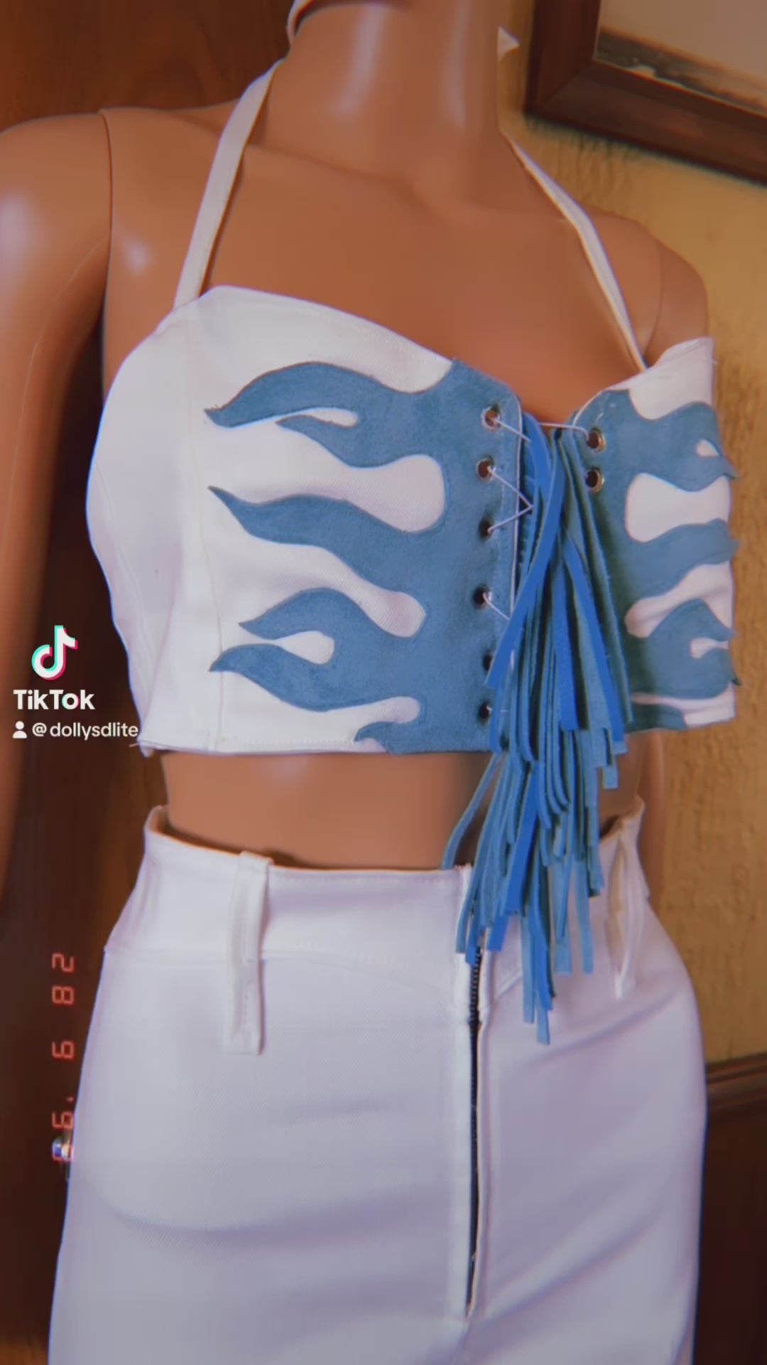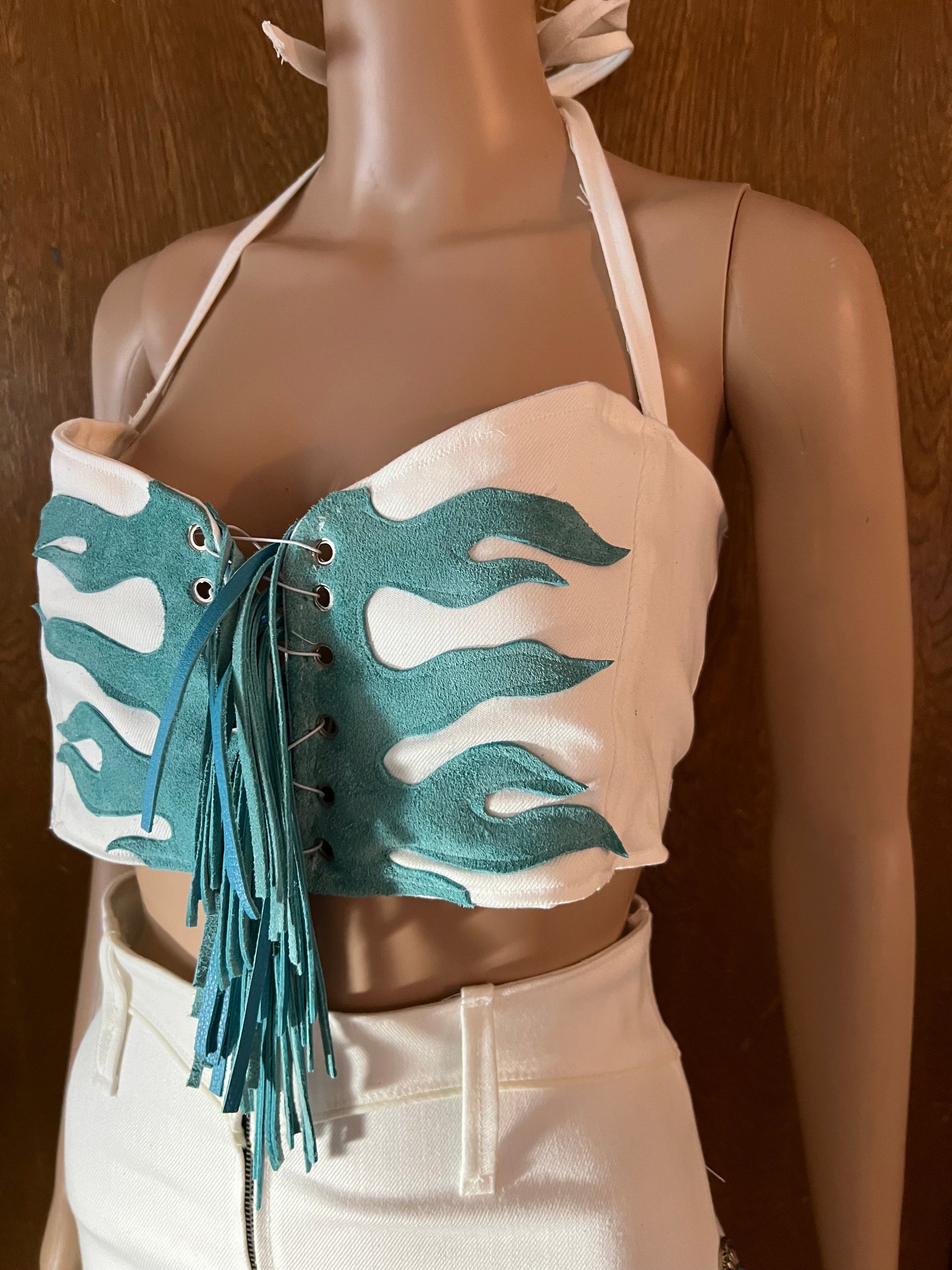 Made to order leather flames halter top is composed out of hand cut leather and stretch denim. Leather flames and fringe are hand drawn, hand cut.Halter top ties at neck and back with a stretchy corded corset. Pants are sold separately.