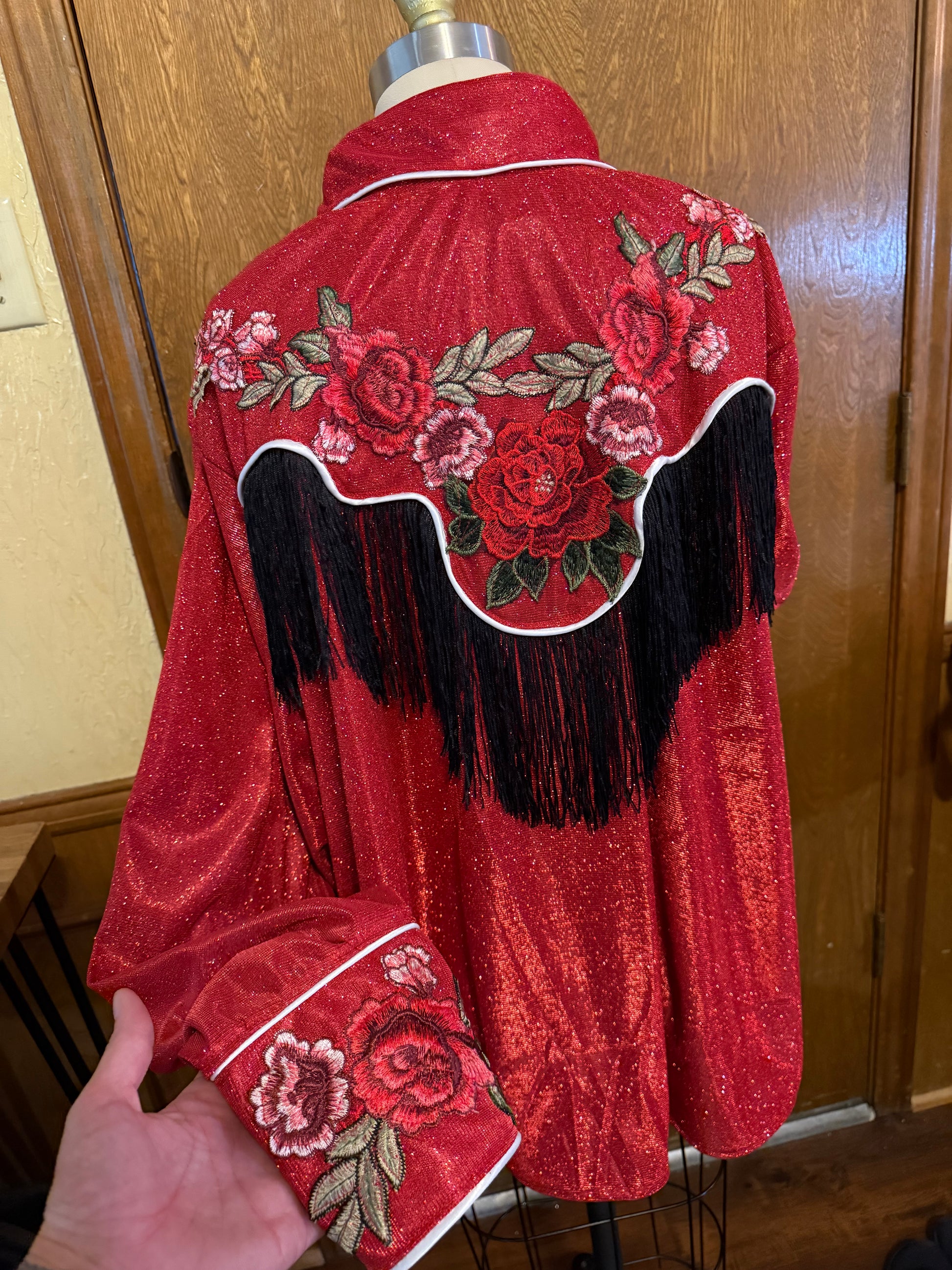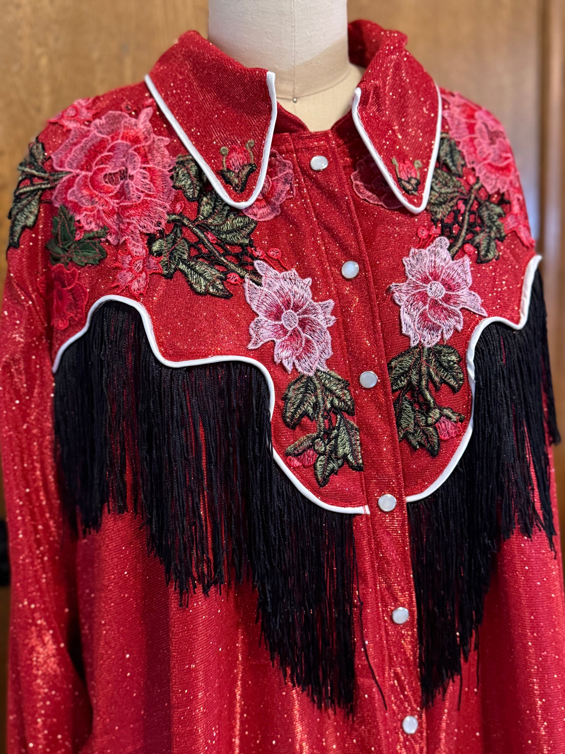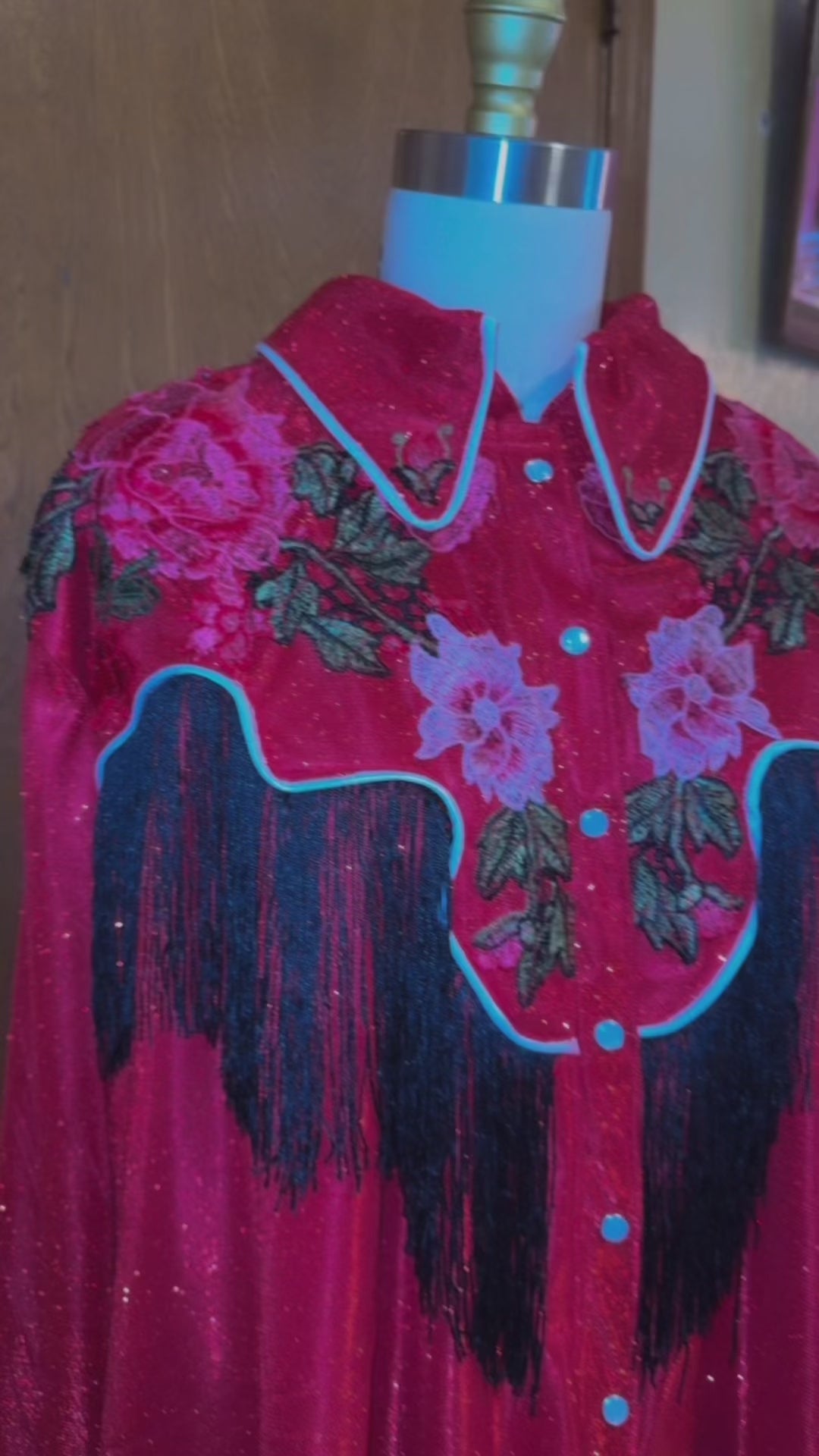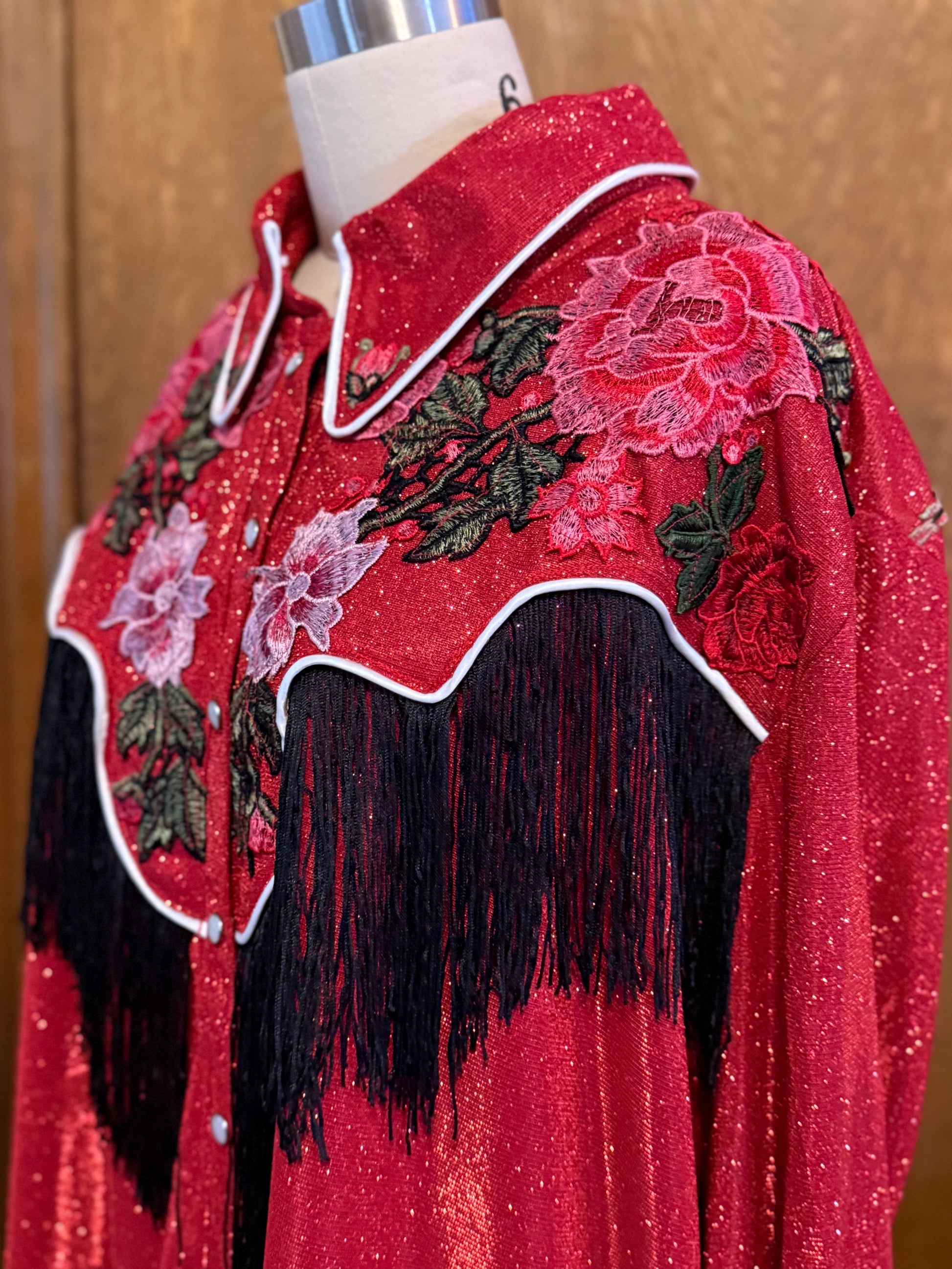 Lurex vintage style western pearl snap shirt with fringe trim and floral embroidery over both yolks, collar, and cuffs! Incredibly beautiful and unique piece.
