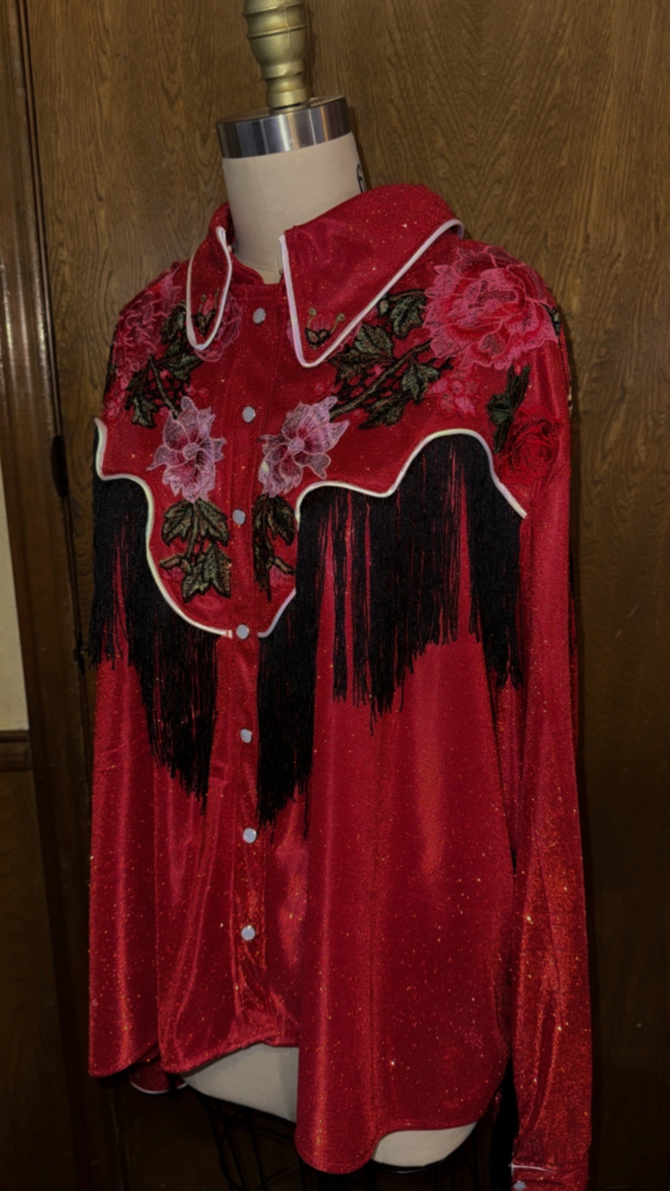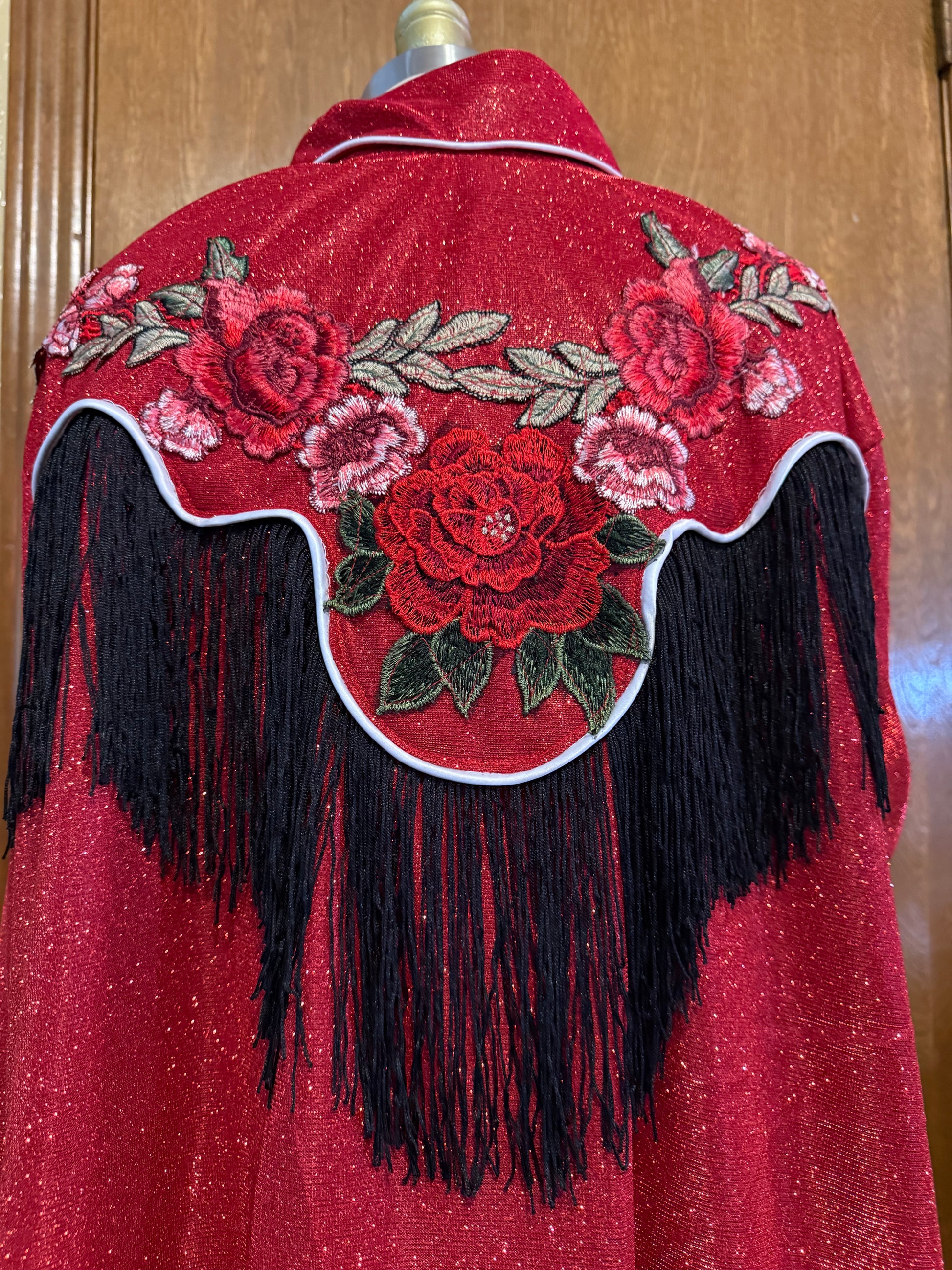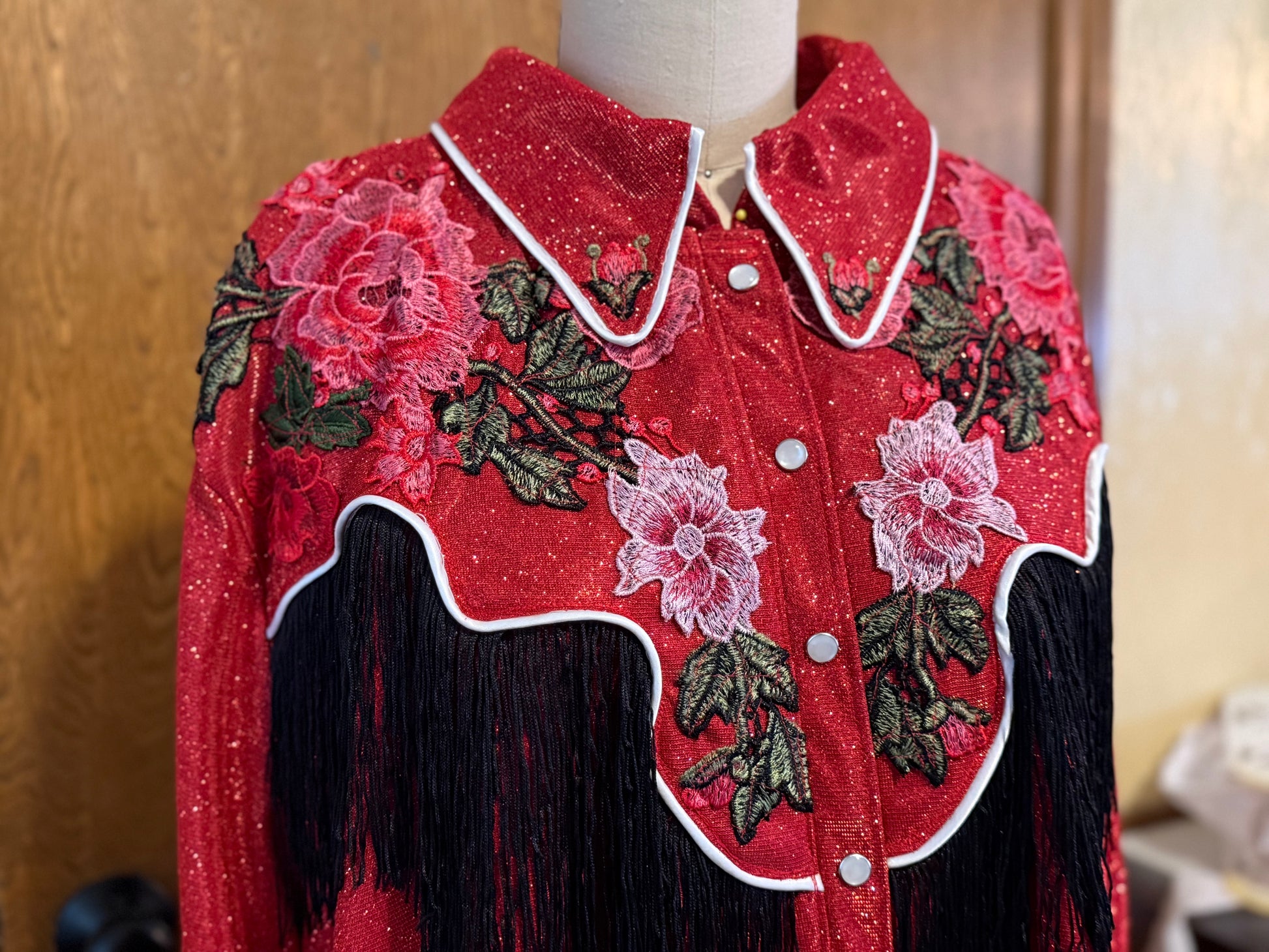 Lurex vintage style western pearl snap shirt with fringe trim and floral embroidery over both yolks, collar, and cuffs! Incredibly beautiful and unique piece.