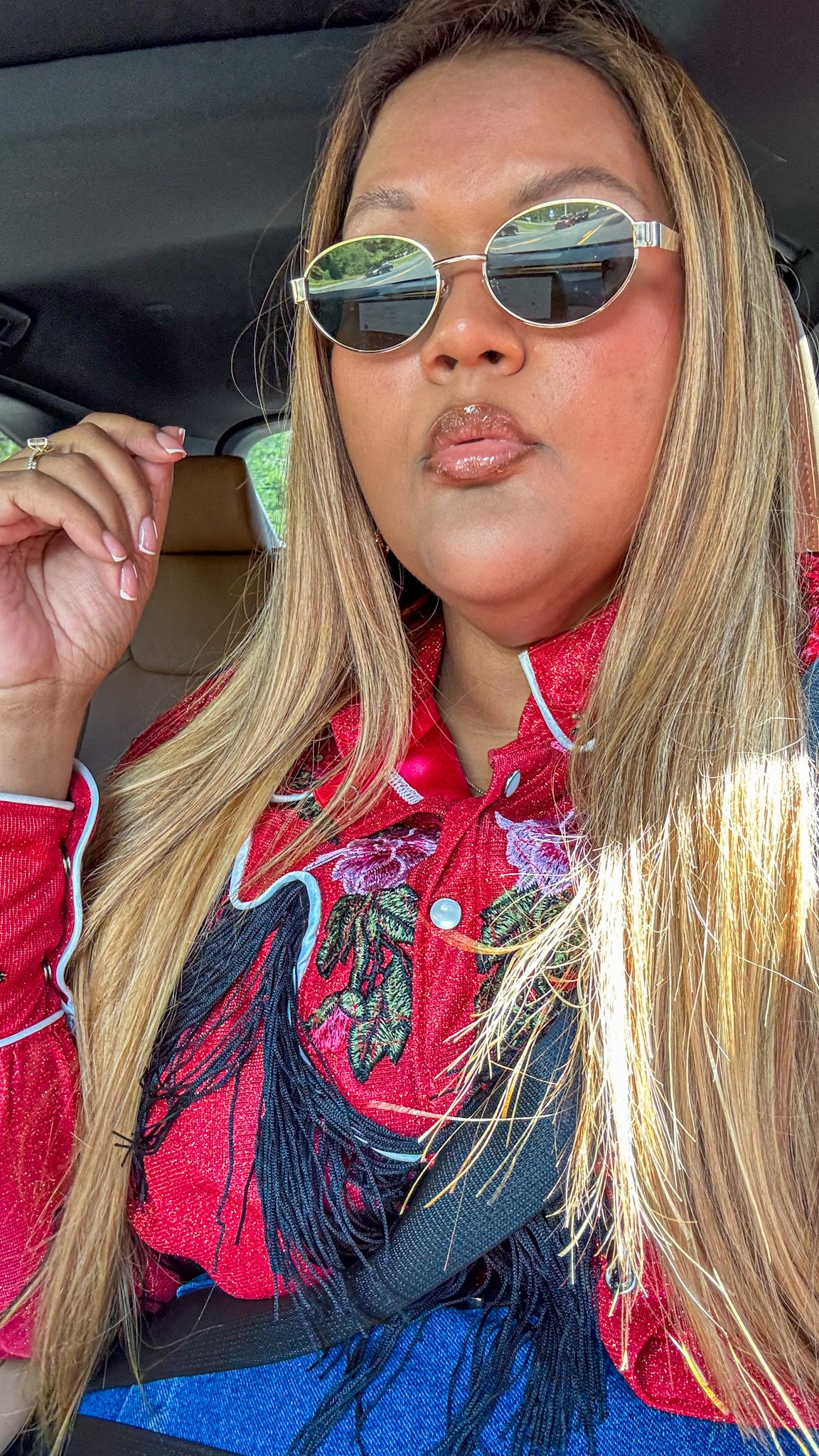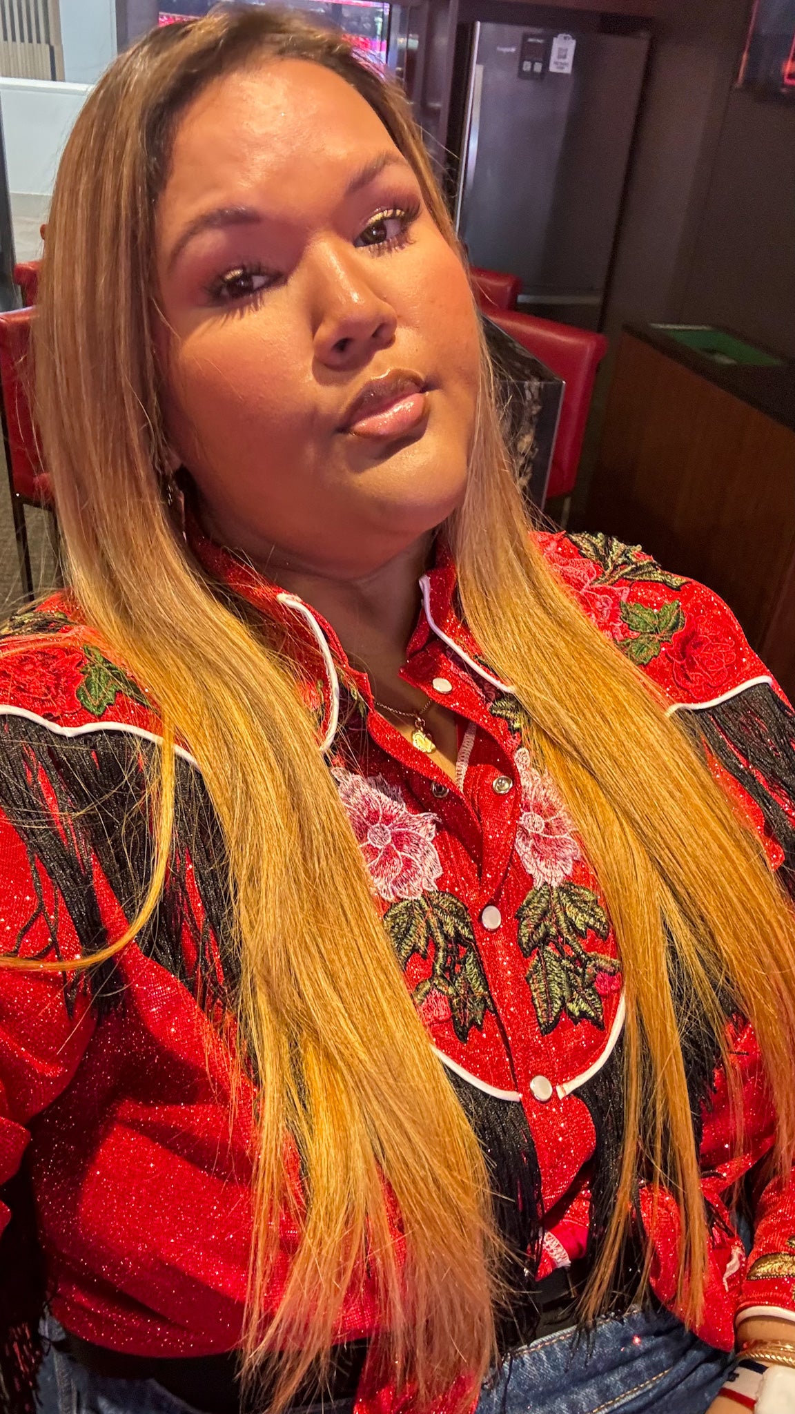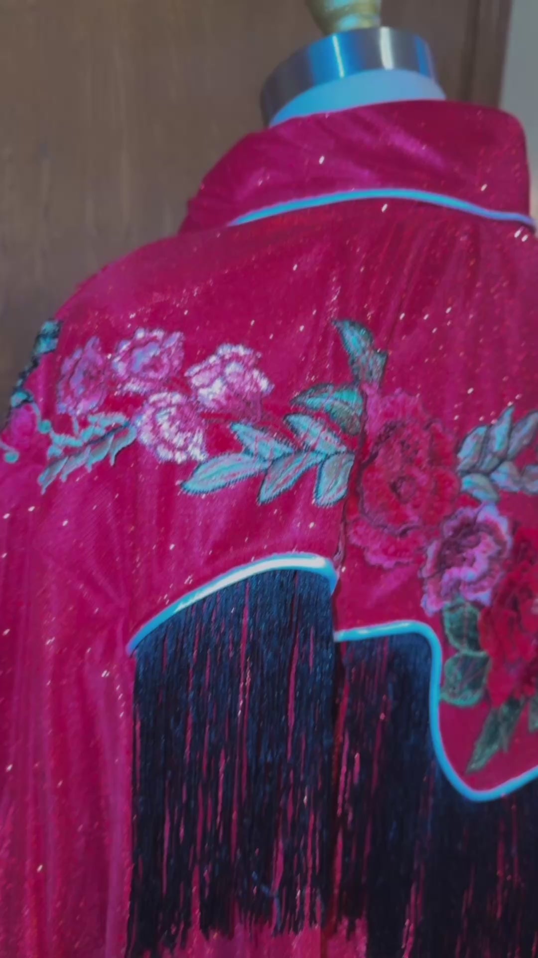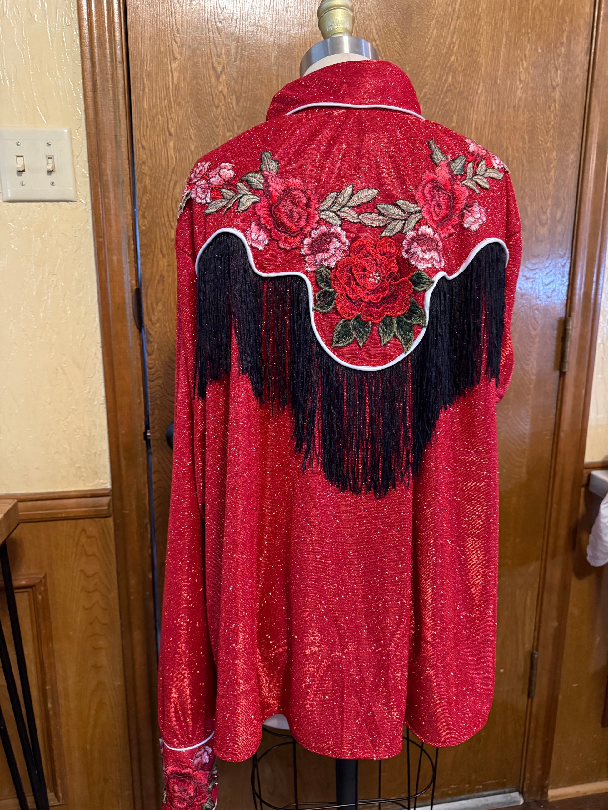Lurex vintage style western pearl snap shirt with fringe trim and floral embroidery over both yolks, collar, and cuffs! Incredibly beautiful and unique piece.