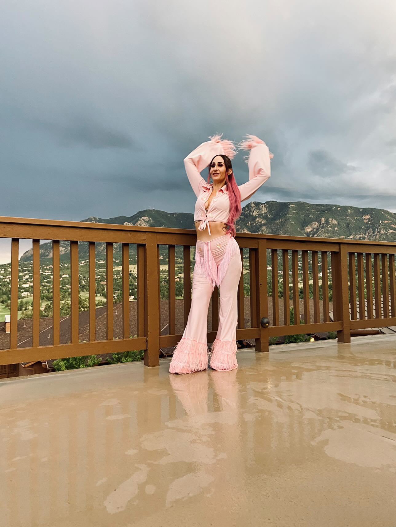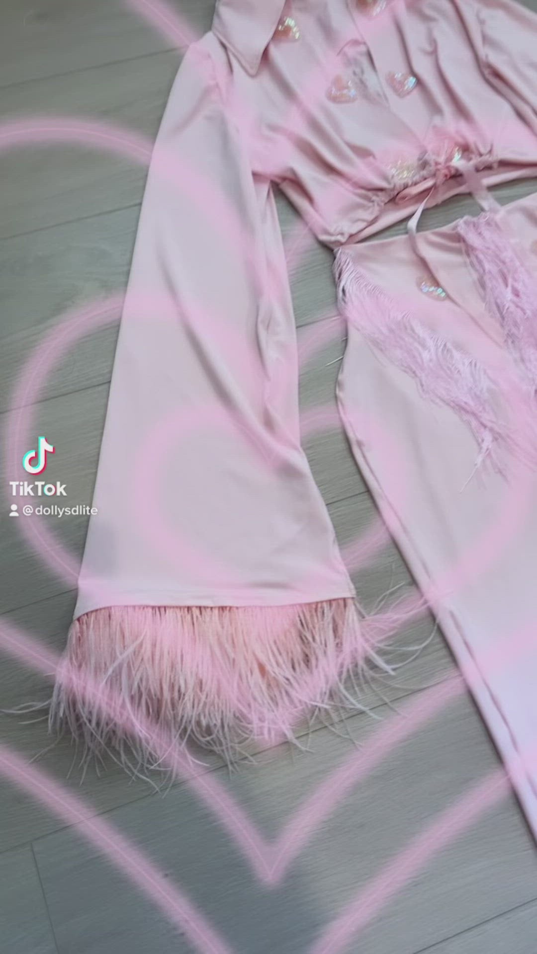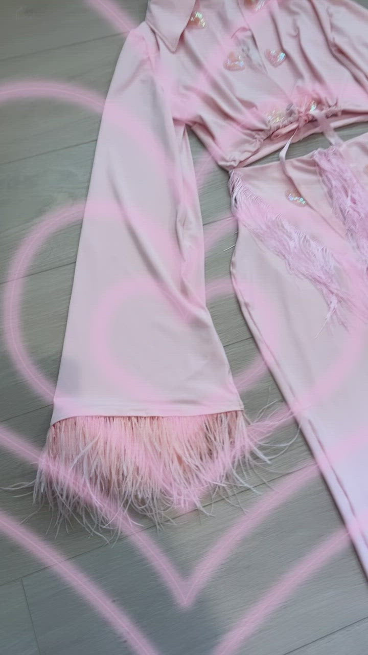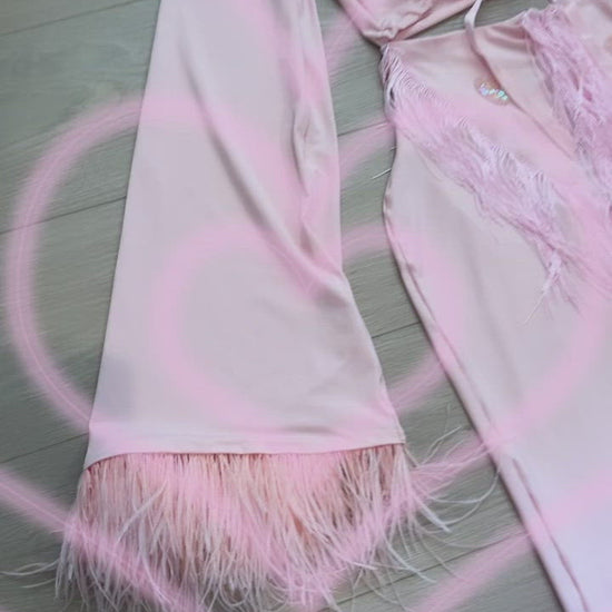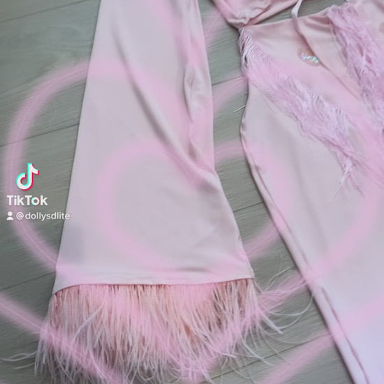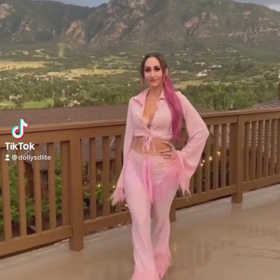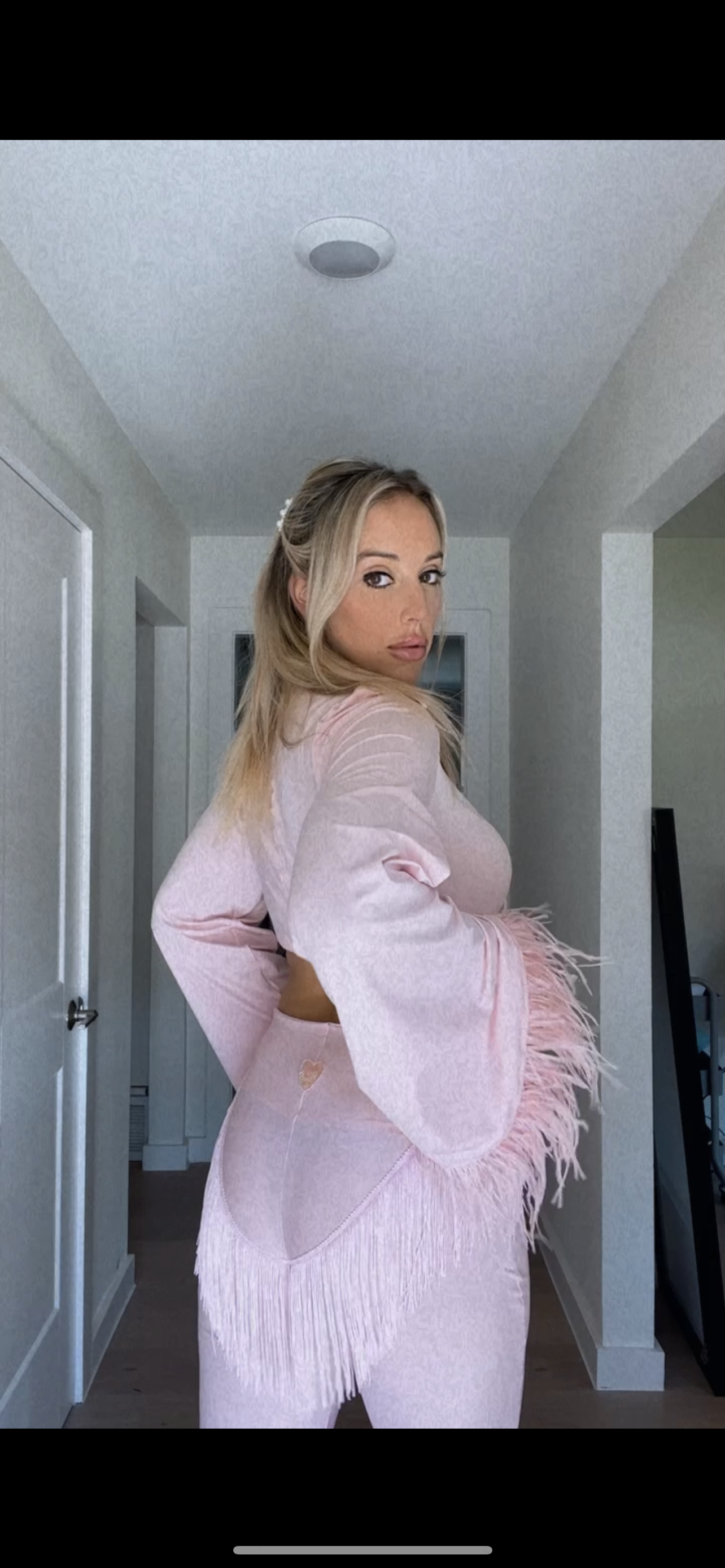 Made to order two piece set is customizable by feather, fringe, and fabric color!