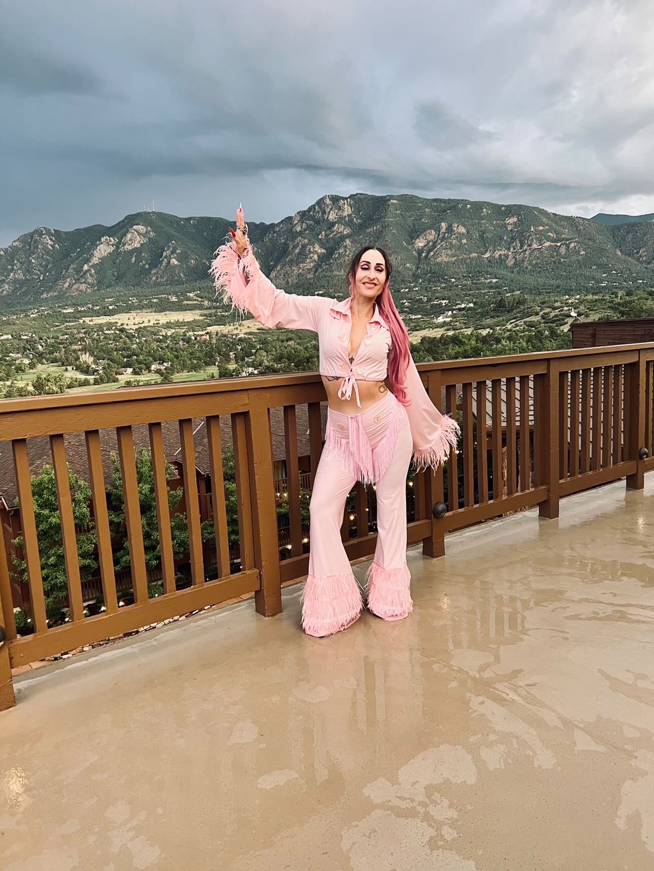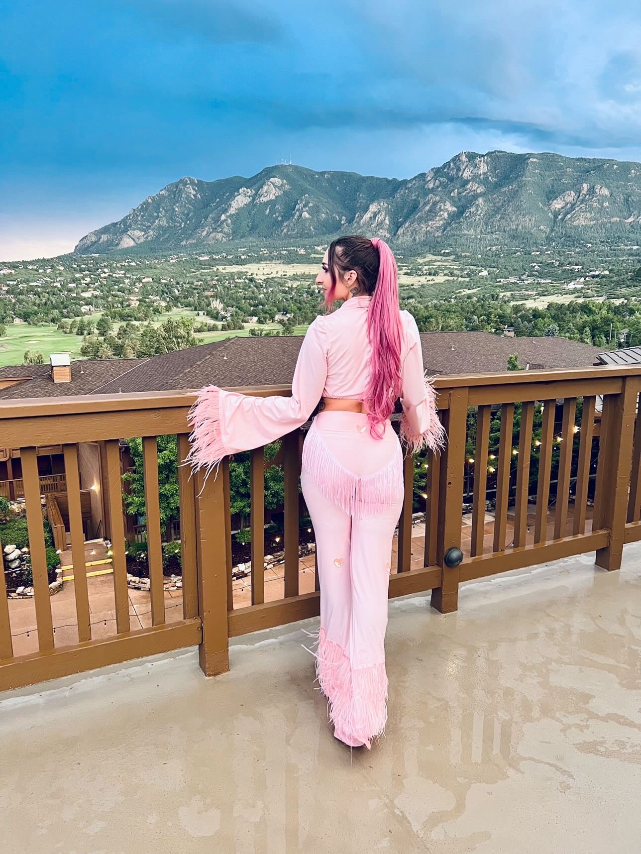 Set is made out of a 4 way stretch, lightweight knit and has custom sequin appliqué, pearl snap closure, zip up pant, fringe, feather, and satin ribbon detail.