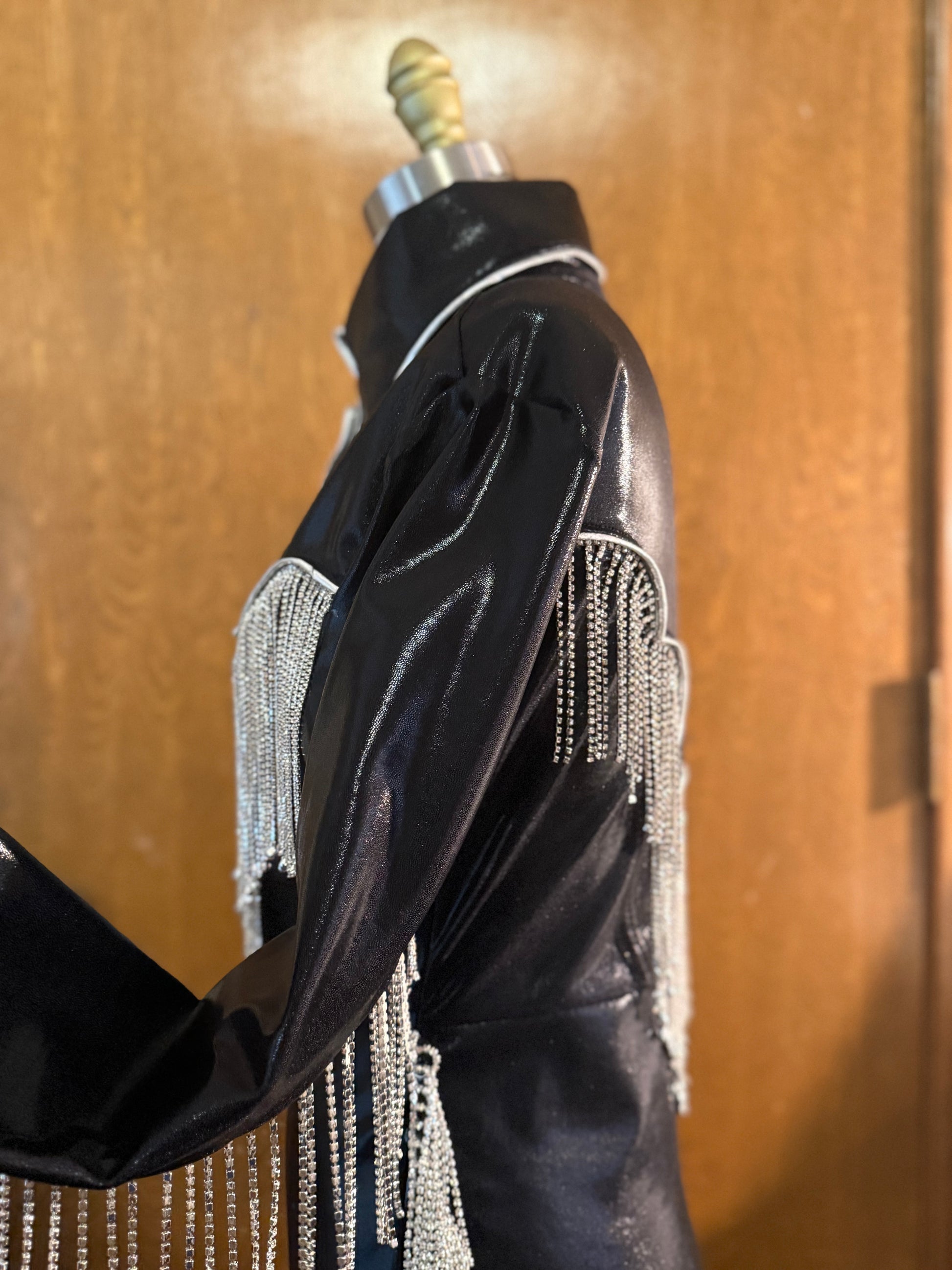 Glittery rhinestone fringed pearl snap dress is made to order in a 4 way stretch mystique spandex and ready to light up any room!