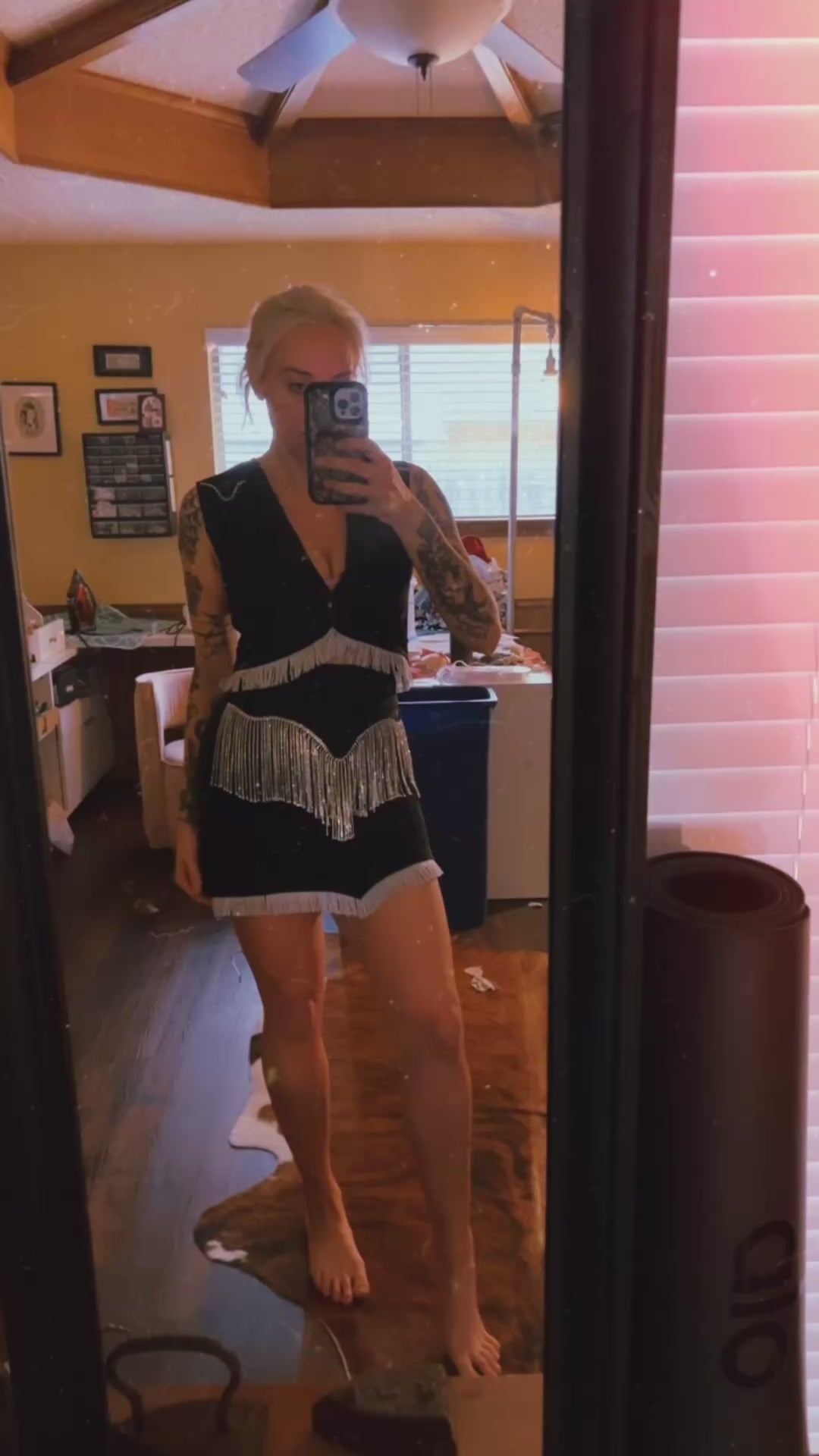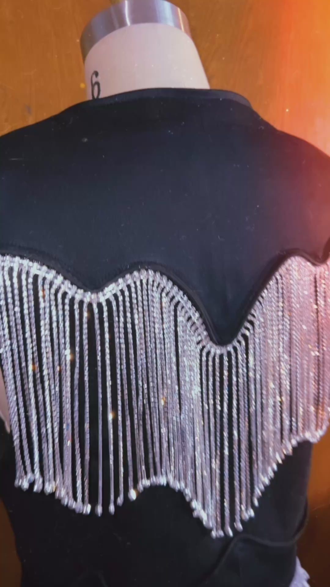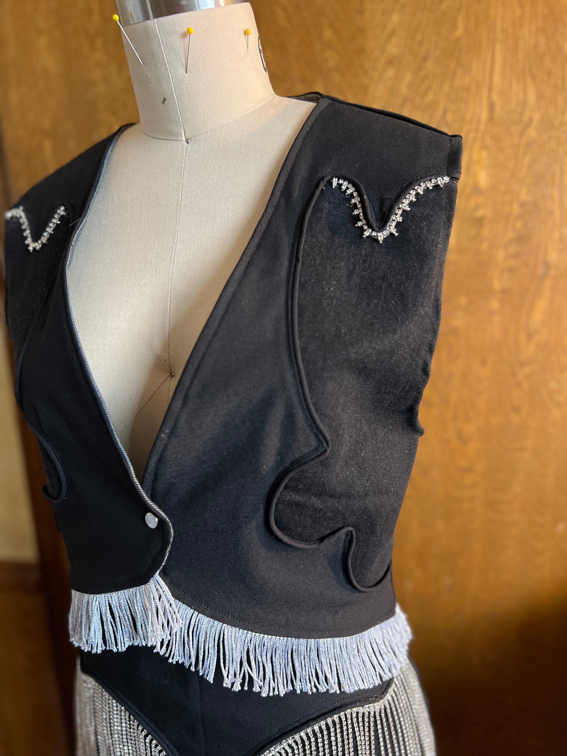 Made to order vest & skirt set is cut from a black stretch denim and features custom western yolk with piping and rhinestone fringe trim. Set is customizable by color and design.