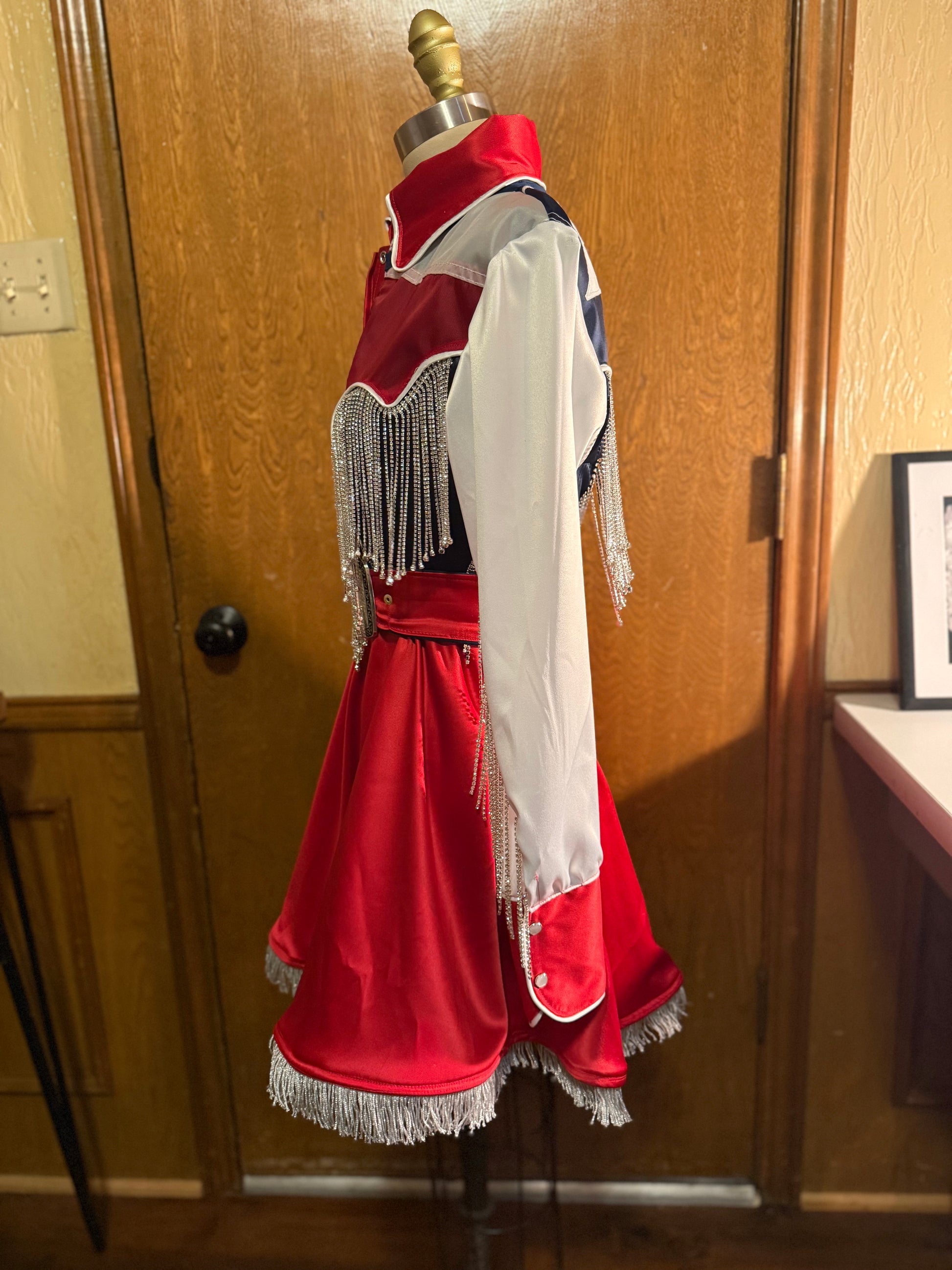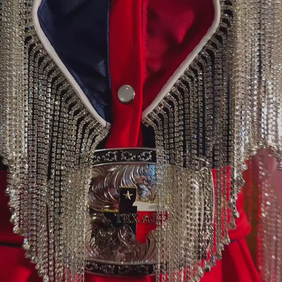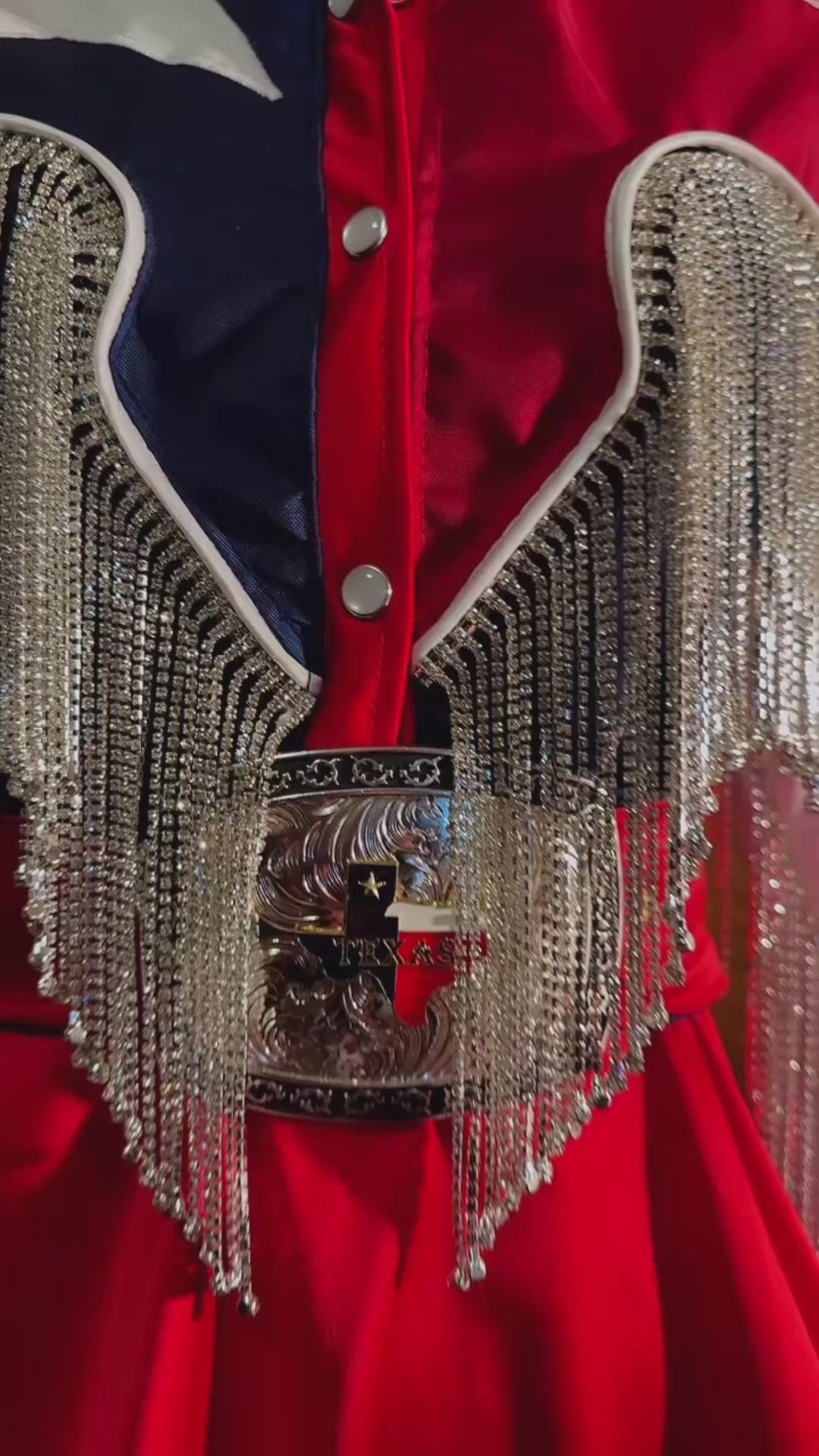 You won’t be lonely for long in the lone star dress! Made to order a line pearl snap dress features rhinestone fringe and silver metallic fringe. Dress is made out of a high quality satin and Texas flags. Dress comes complete with a matching satin belt with oversized Texas belt buckle.