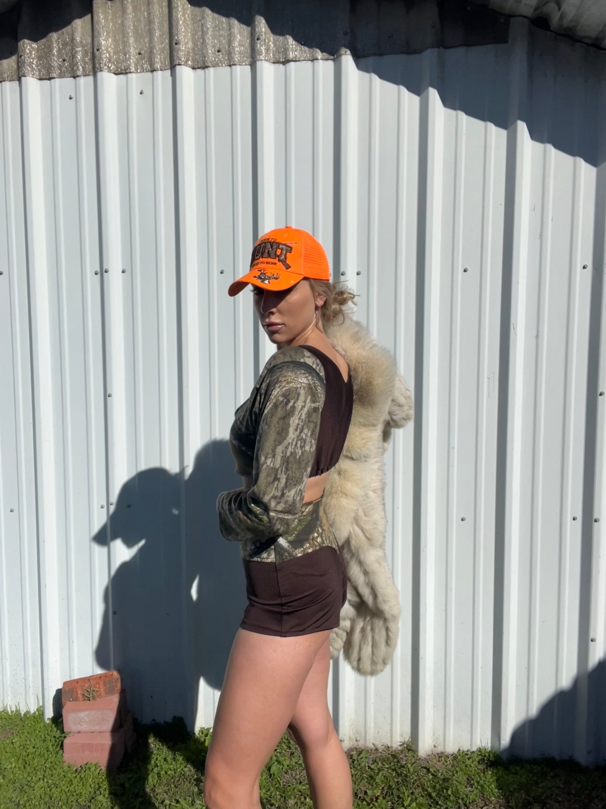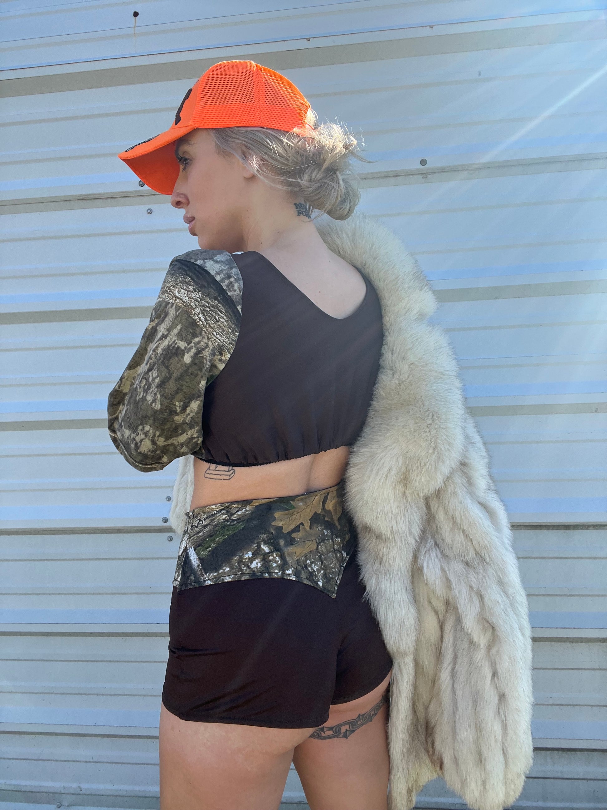 Made to order from the Holler n Squalor collection. Set comes with corset spandex top and matching spandex shorts. Set features real tree western yolk on the shorts.